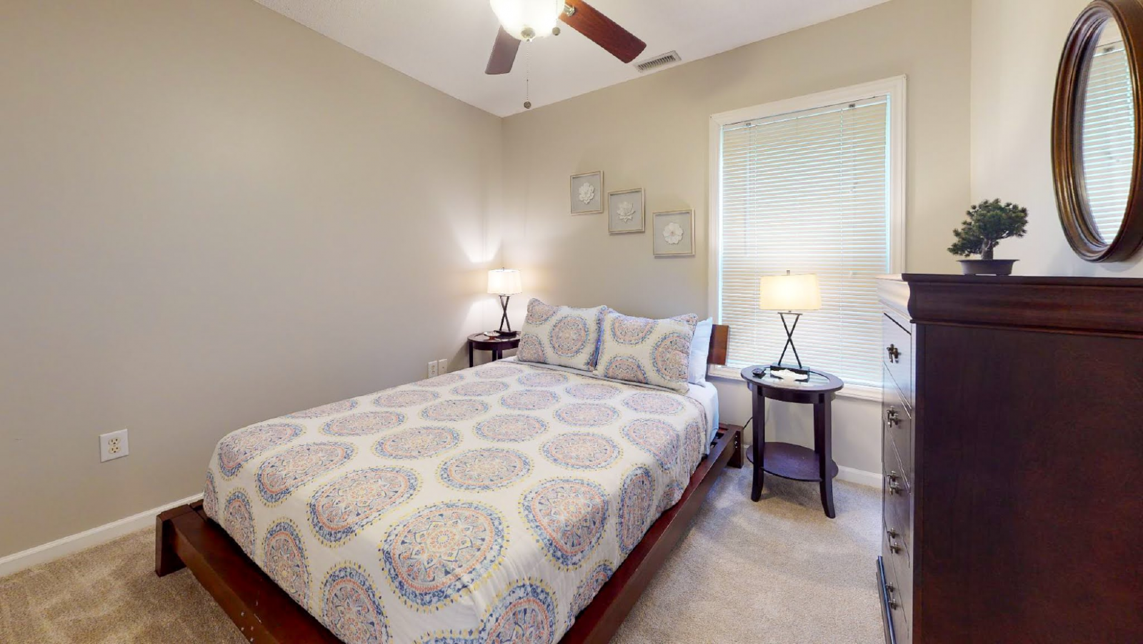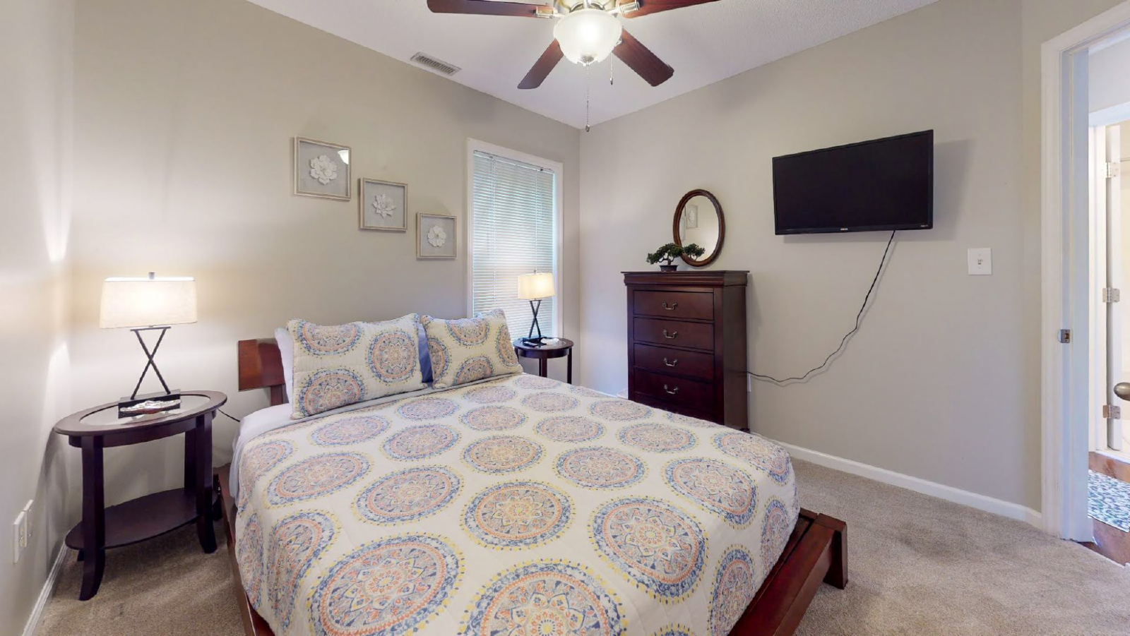The second bedroom has a Queen Japanese-style platform bed with a memory foam topper, dresser, lamps with USB ports, and a convenient swivel wall-mounted 32" TV.