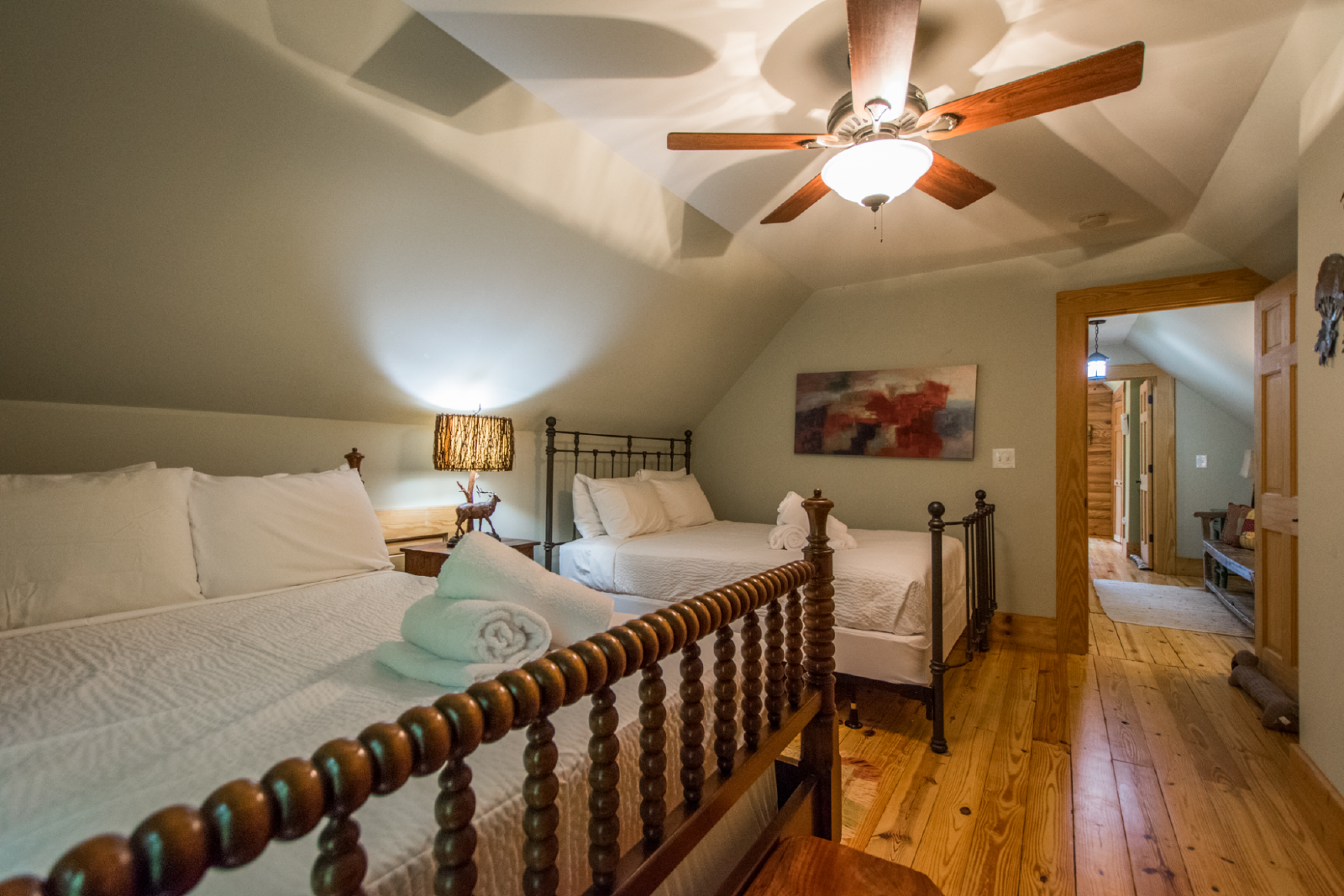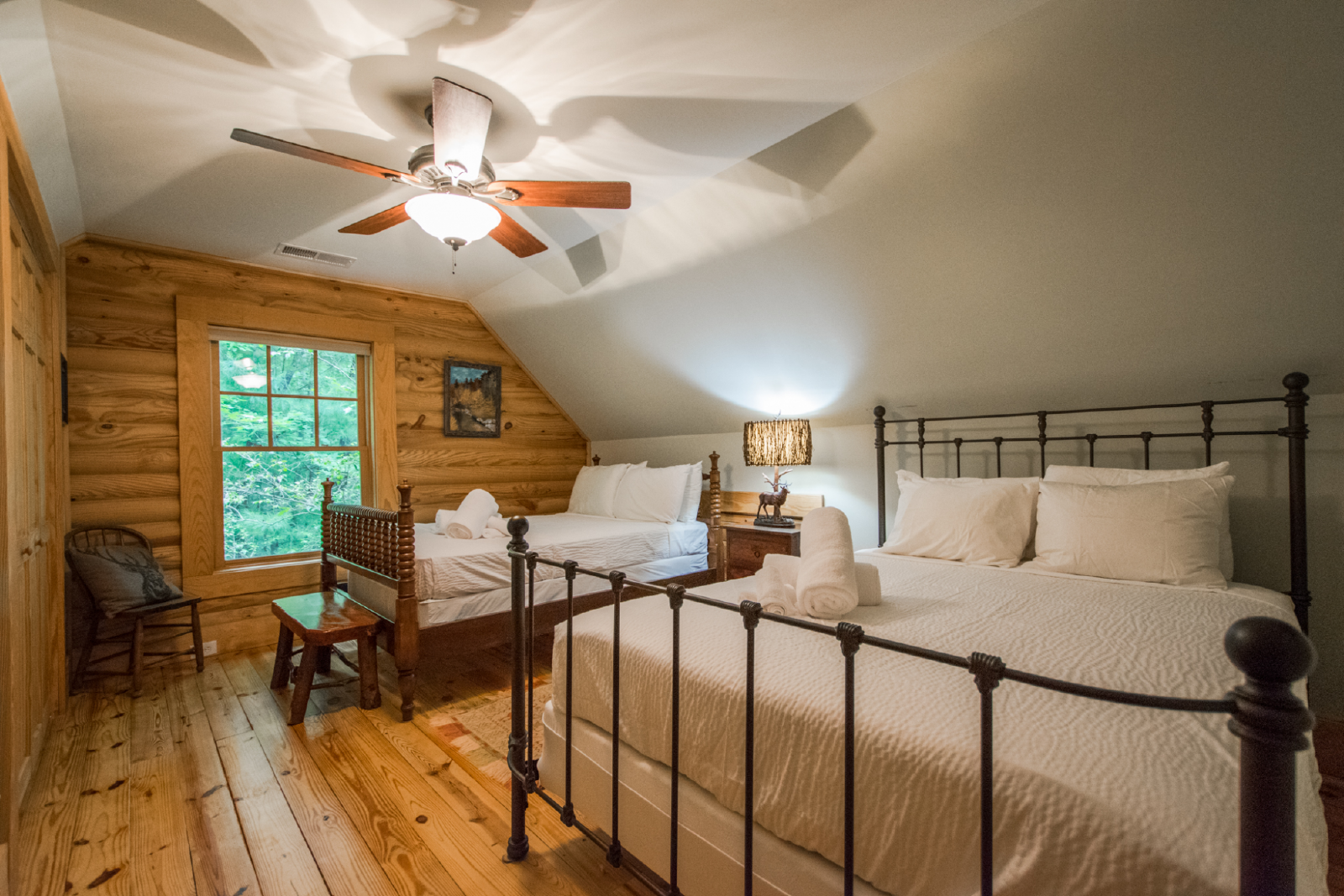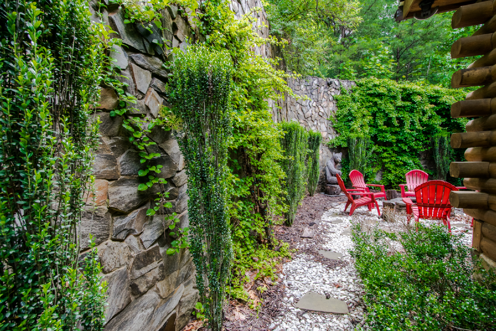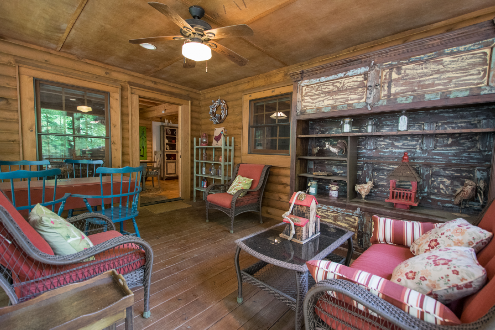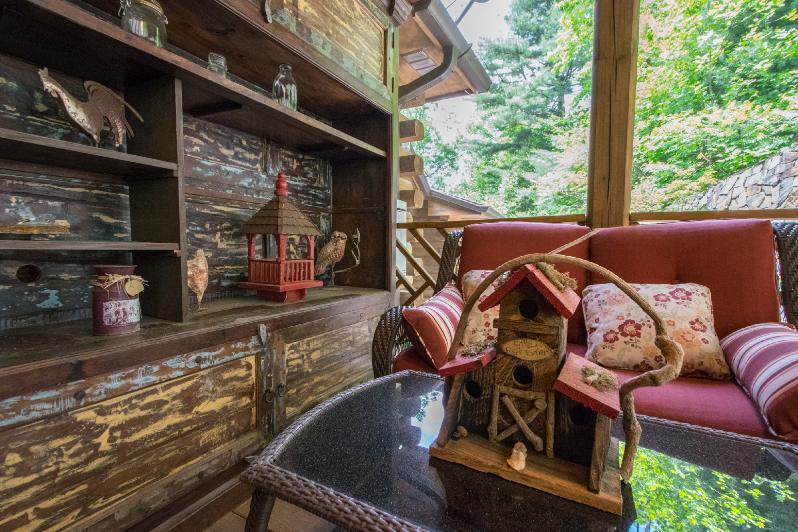 Outside, the private yard offers plenty of space for outdoor activities. Gather around the fire pit for s'mores and storytelling under the stars, or simply unwind in the tranquil surroundings. The screened-in porch provides a peaceful spot to enjoy your morning coffee or evening cocktails while taking in the natural beauty.