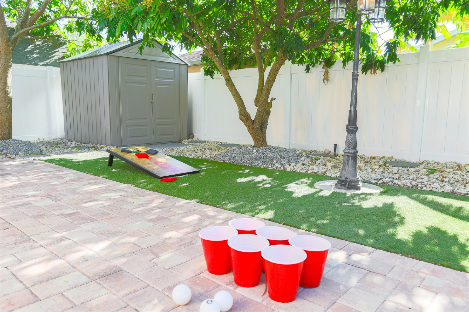 • Backyard with dining table seating for 6, chairs and couch