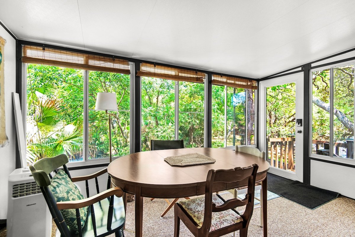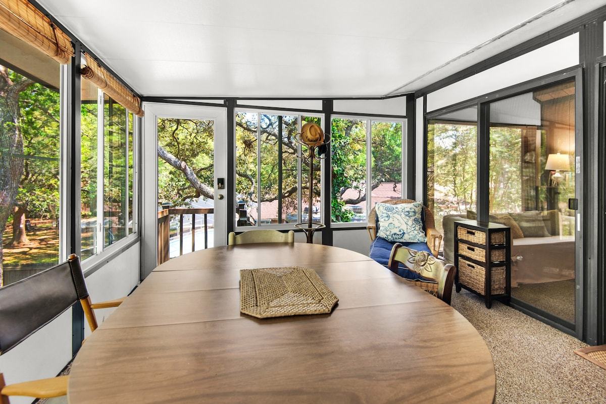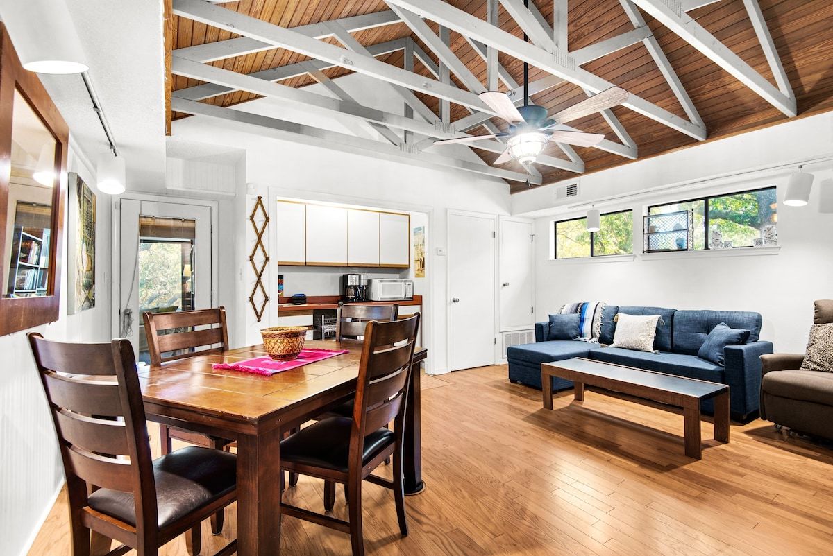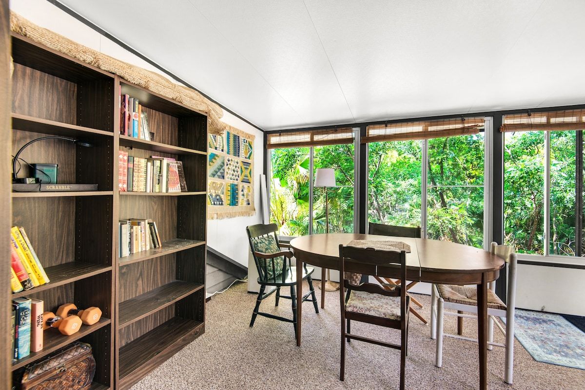 One of the standout features is the “Tree House,” which offers an inspiring view of the backyard jungle, adding a touch of whimsy and adventure to your experience. Large windows allow natural light to flood the space, making it bright and inviting. Whether you’re enjoying a meal, relaxing with a book or play games/cards, this combined living and dining area offers a comfortable and stylish retreat.