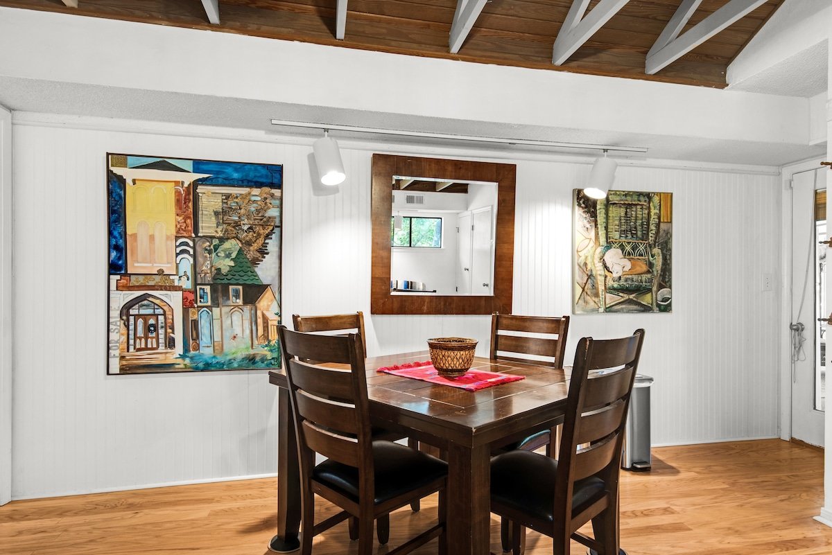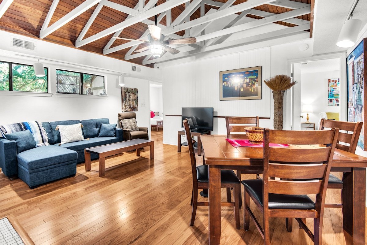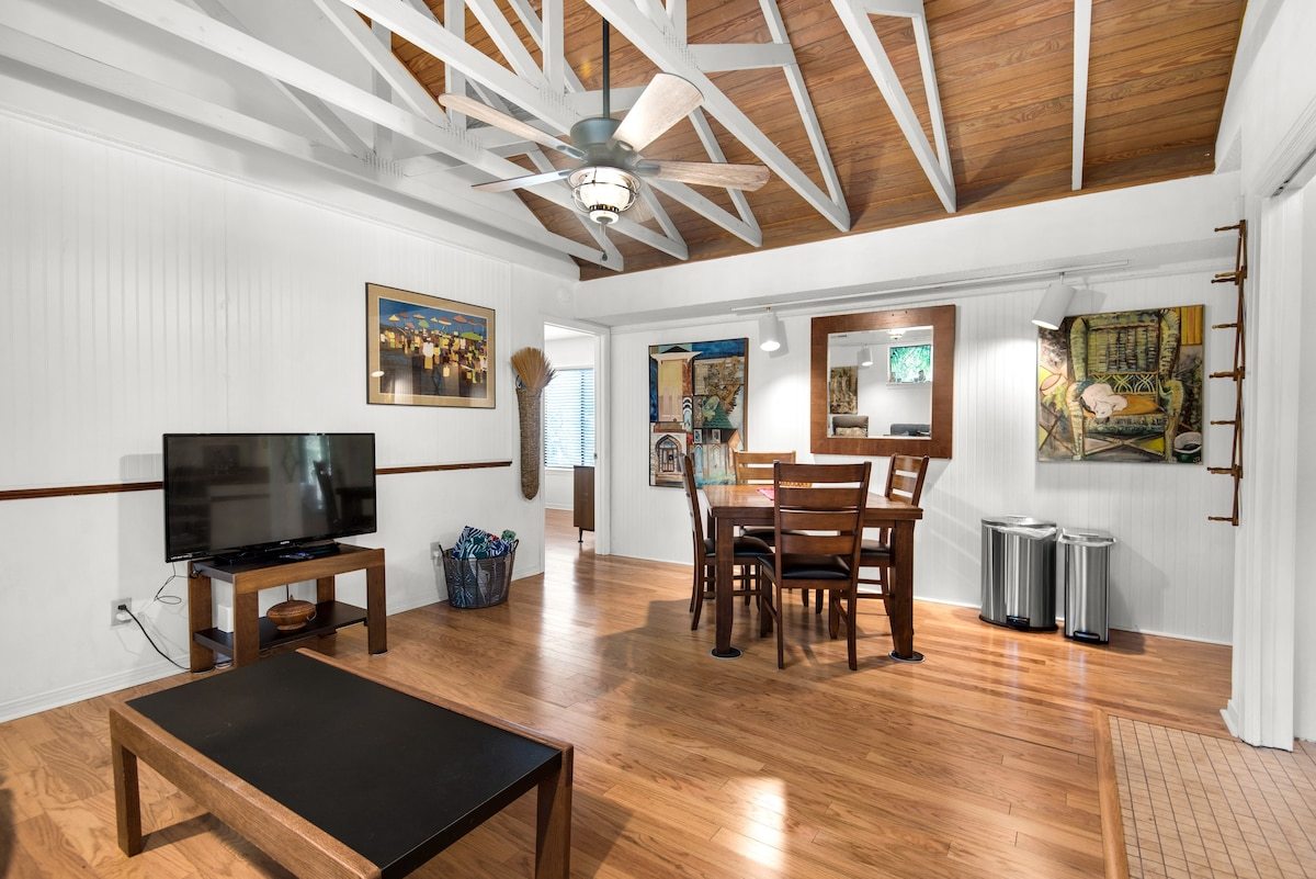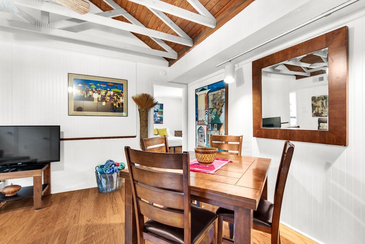 The living/dining area, features a convertible sofa bed, a table to seat four guests, window, hardwood floors, various artwork created by owner, and exposed beams to create a bright and inviting ambiance.