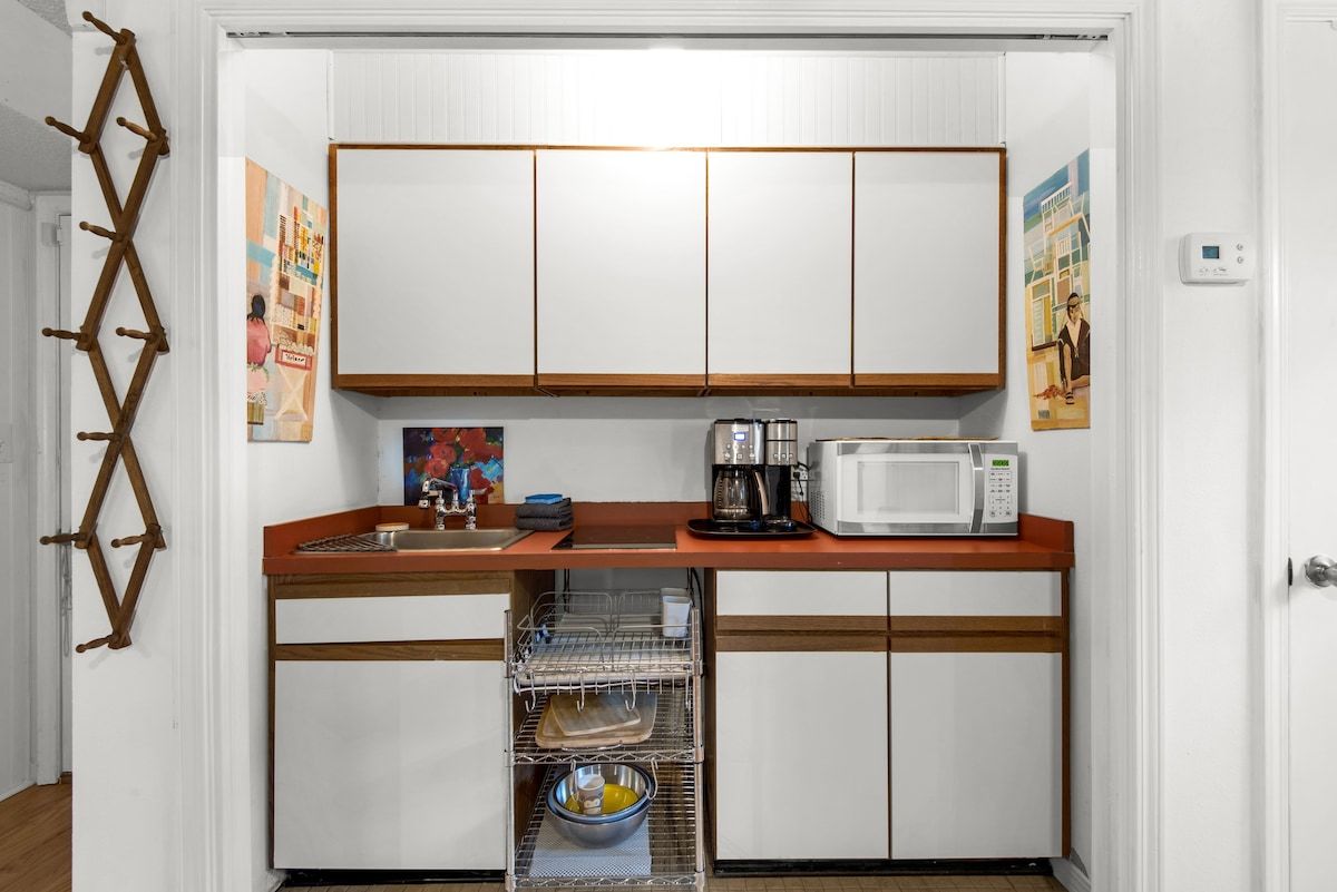 The kitchen, not a fully functioning kitchen, offers compact storage for essentials, and is equipped with a Keurig/coffee maker, microwave, toaster oven, and electric 2-burner stove for light meals.