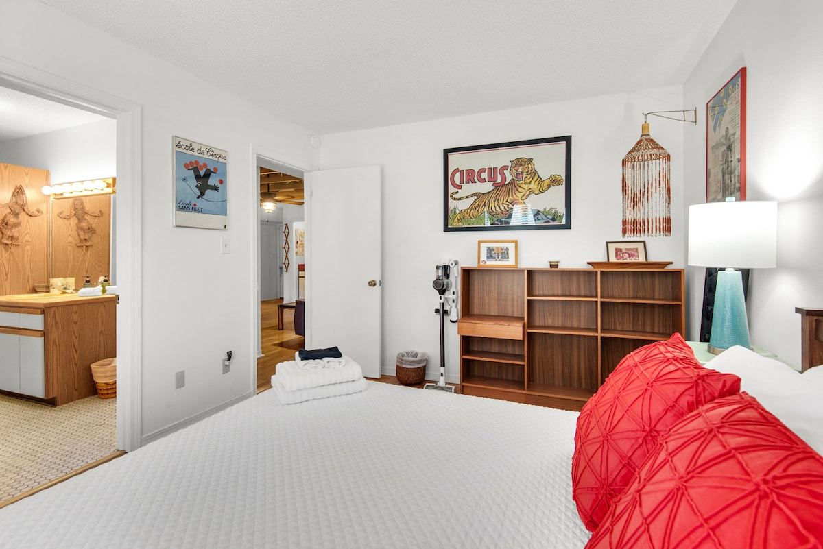The bedroom on the left features a queen bed, nightstand with lamp, dresser, book shelves & side chairs.