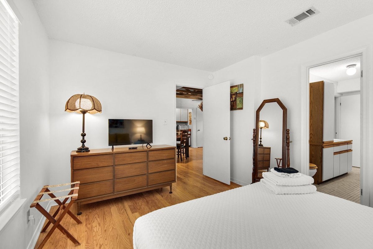 The bedroom on the right features a queen bed, dresser, smart TV, nightstand with a lamp. Adjacent to this room is a Jack & Jill bathroom & another bedroom.