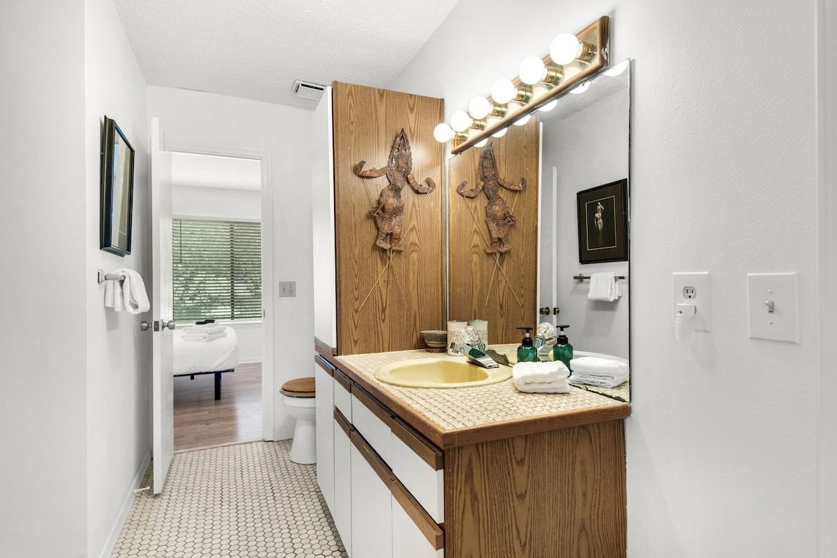 The Jack & Jill bathroom features a single shower, vanity, toilet & cabinets for storage. We provide some starter supplies/essentials: toilet paper, shampoo, conditioner, body wash, and make-up wipes.