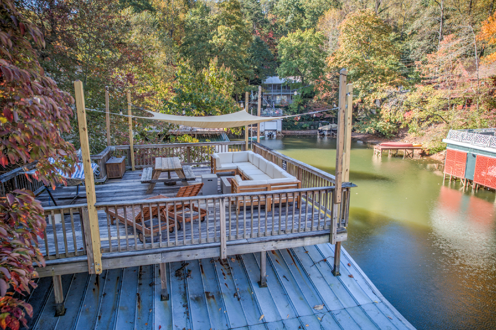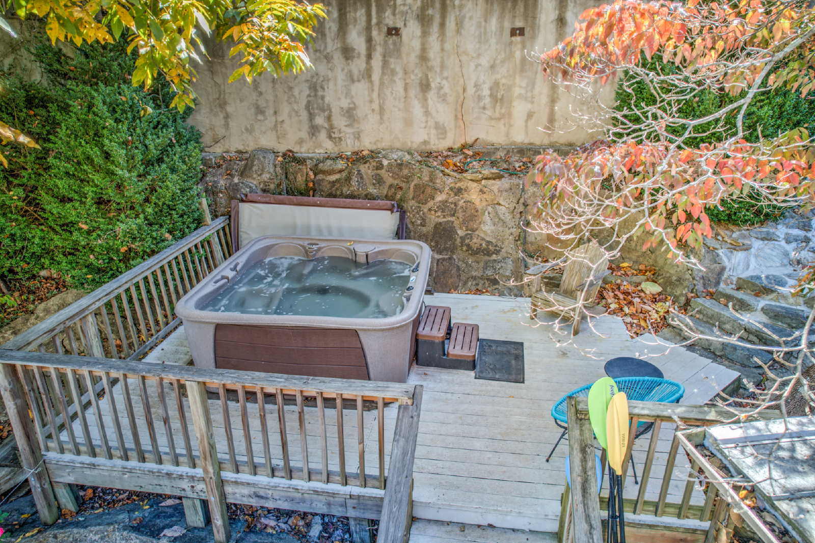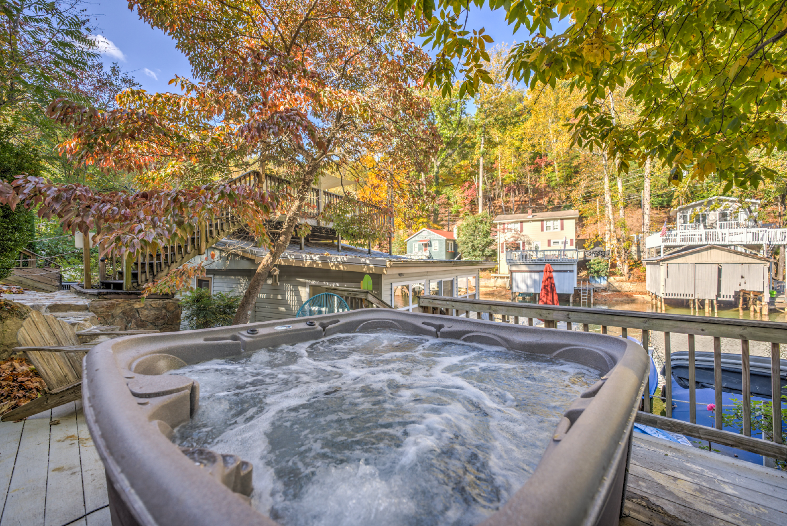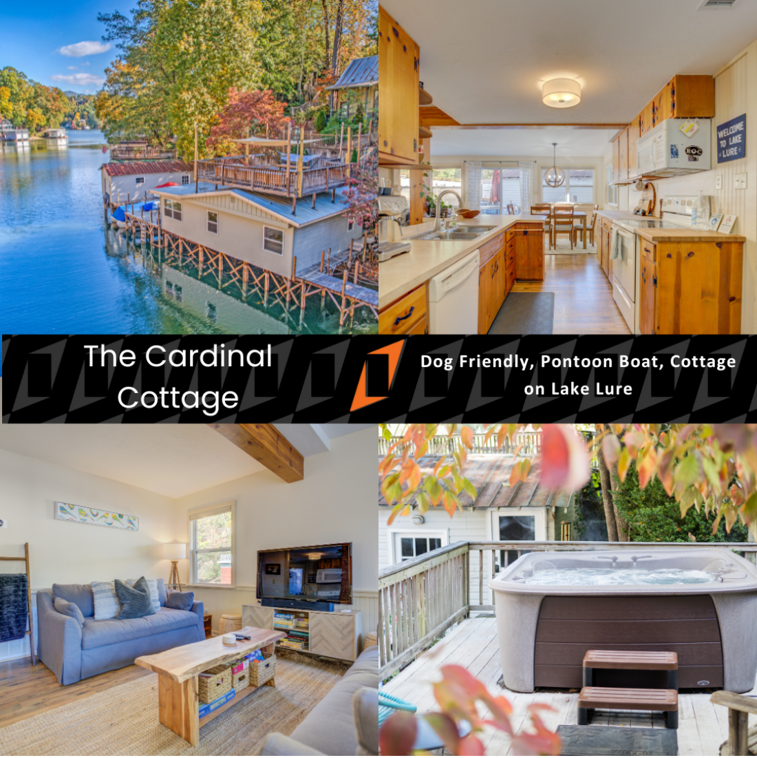 PMI Blue Ridge invites you to come to Lake Lure and stay ON the water. The Cardinal Cottage is built right over the lake and comes complete with a hot tub and 2-person kayak, with a pontoon boat available for rent. The rooftop deck with fire table is a fantastic place to relax. Move down to the table on the dock overlooking the water and end your day with a soak in the hot tub. This is lake life at its best! And bring the dogs (additional fee required)! They will love the lake too.