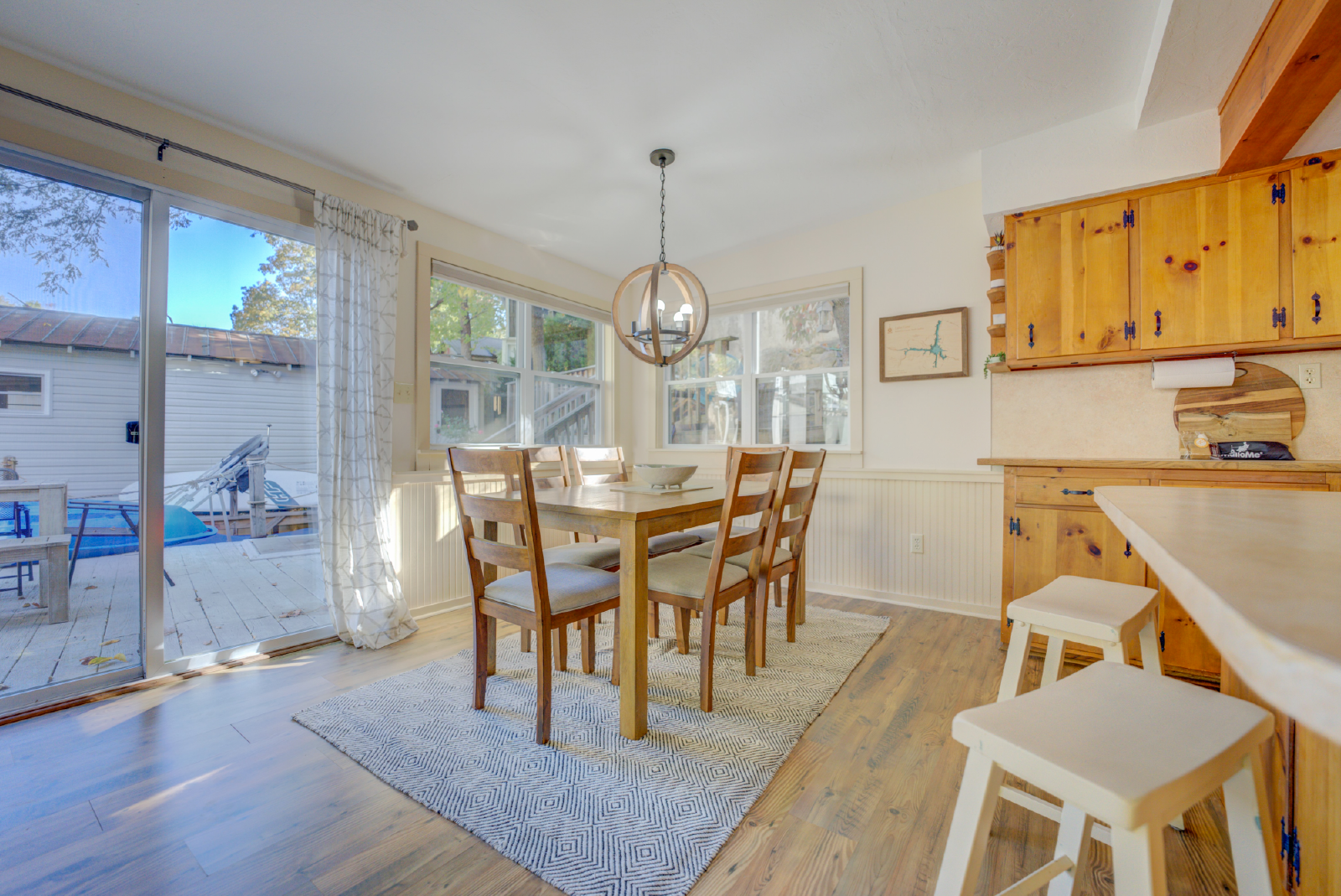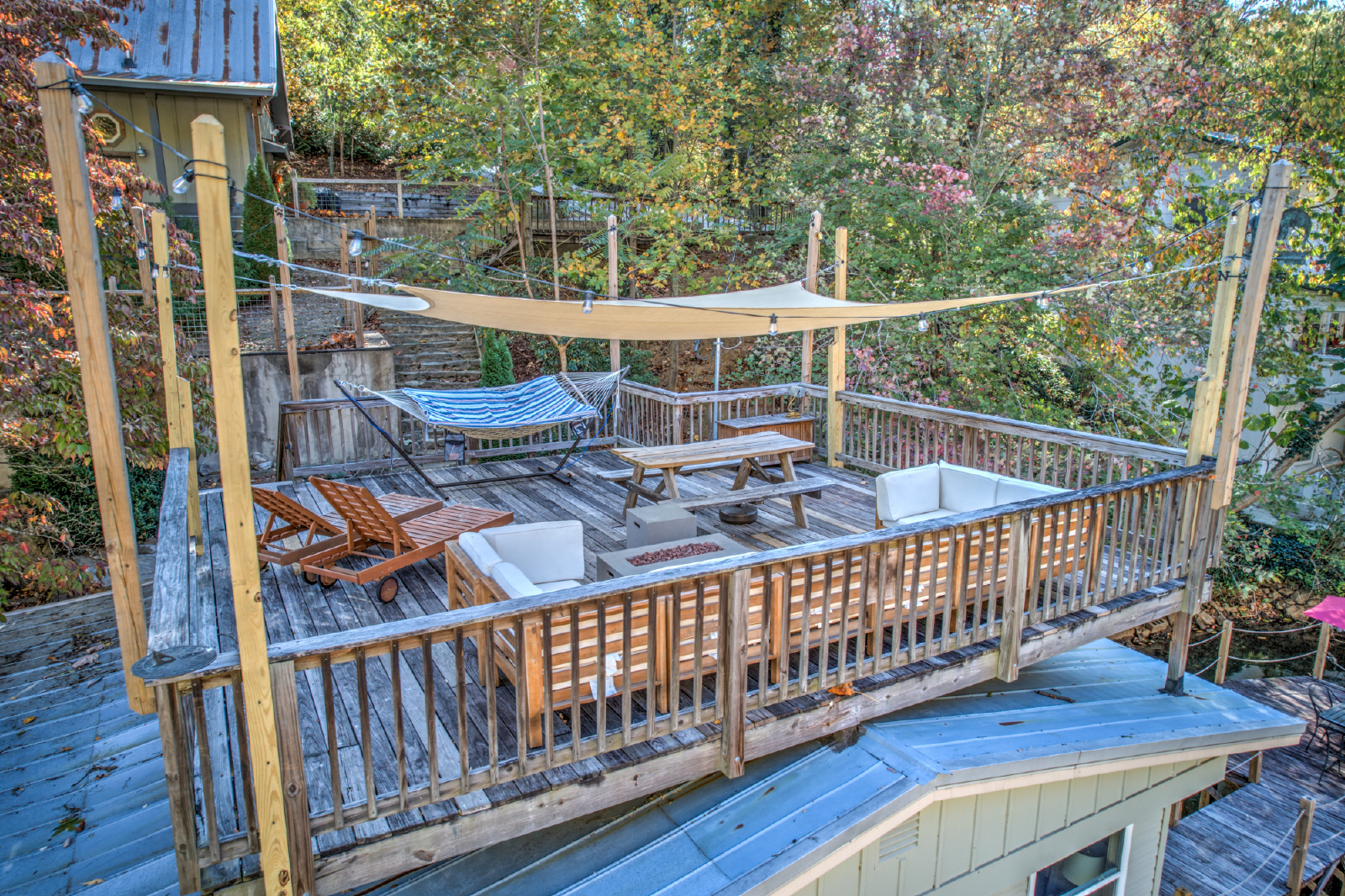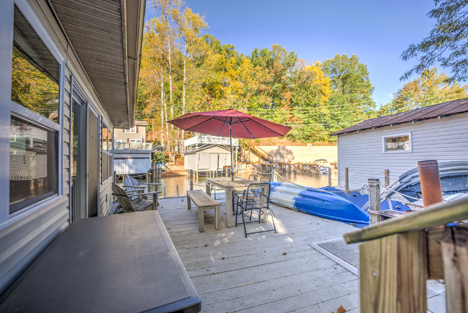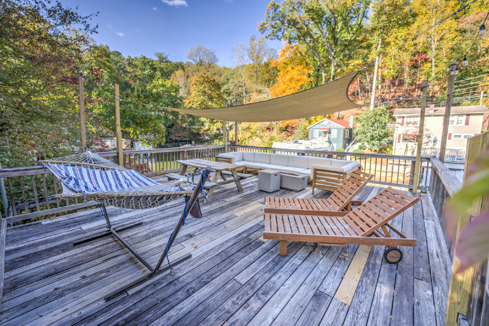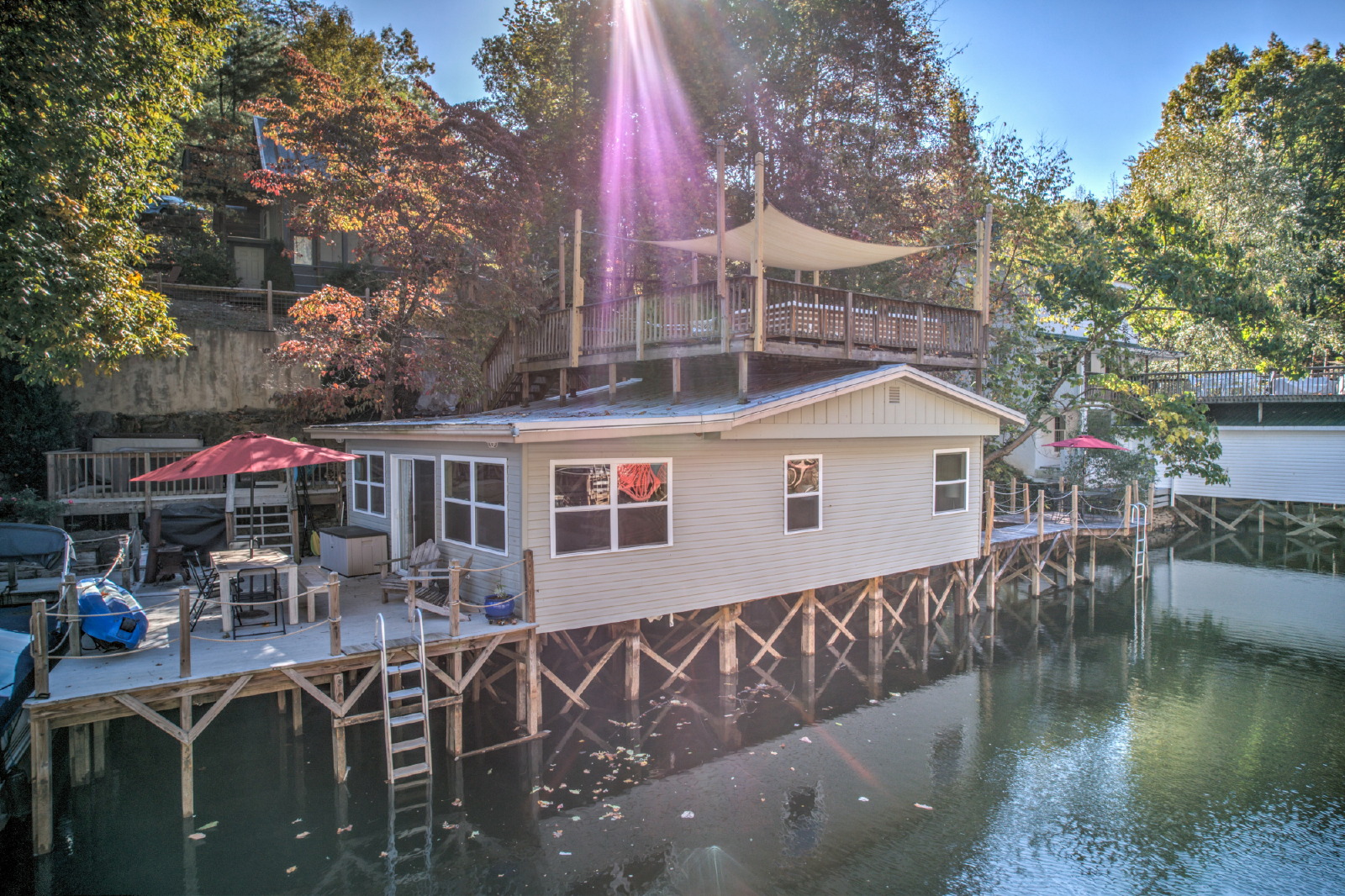 PMI Blue Ridge invites you to come to Lake Lure and stay ON the water. The Cardinal Cottage is built right over the lake and comes complete with a hot tub and 2-person kayak, with a pontoon boat available for rent. The rooftop deck with fire table is a fantastic place to relax. Move down to the table on the dock overlooking the water and end your day with a soak in the hot tub. This is lake life at its best! And bring the dogs (additional fee required)! They will love the lake too.