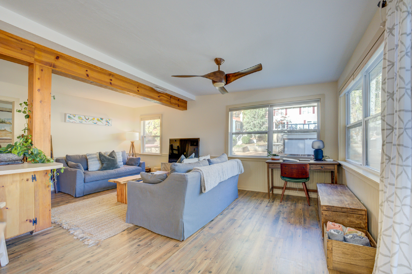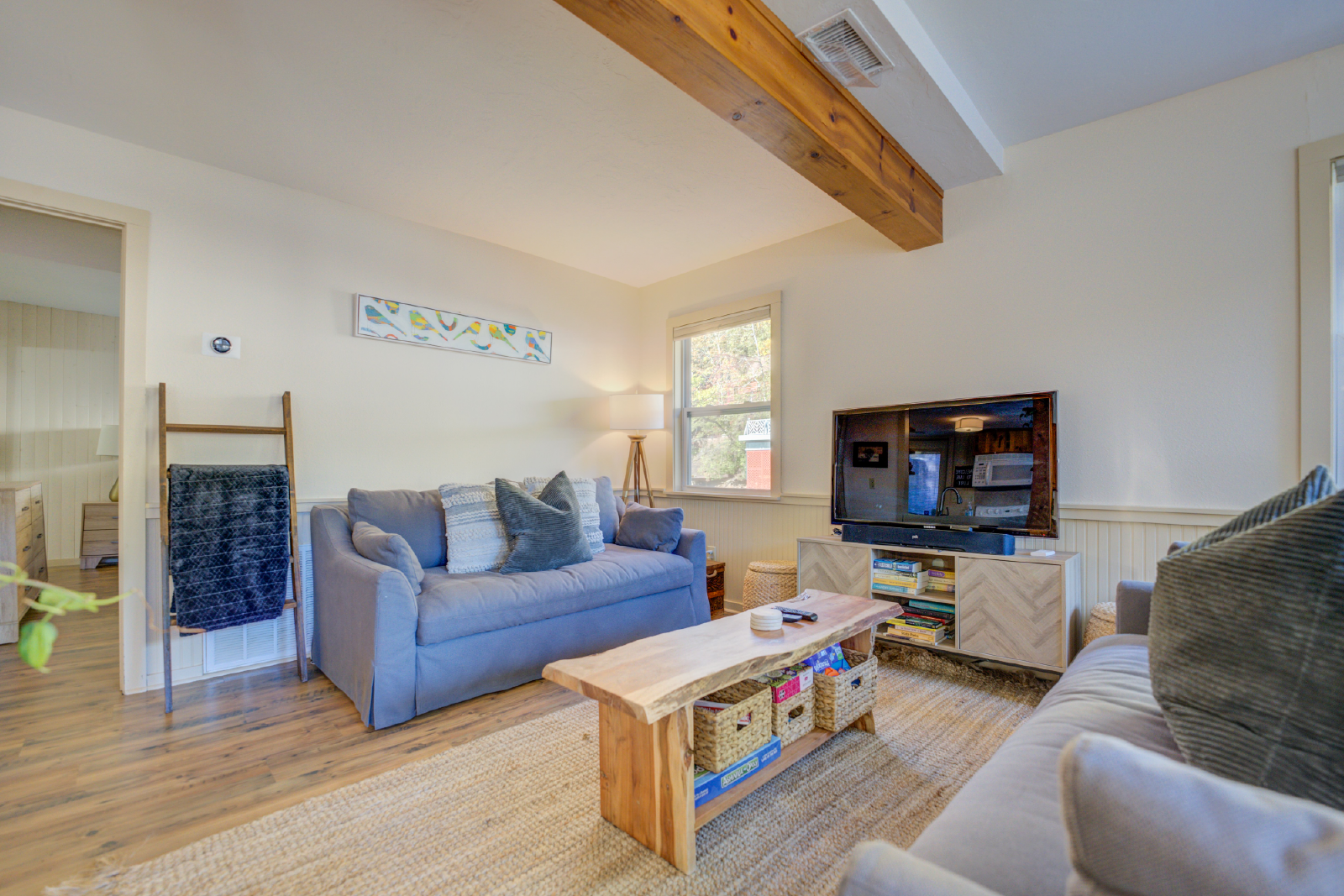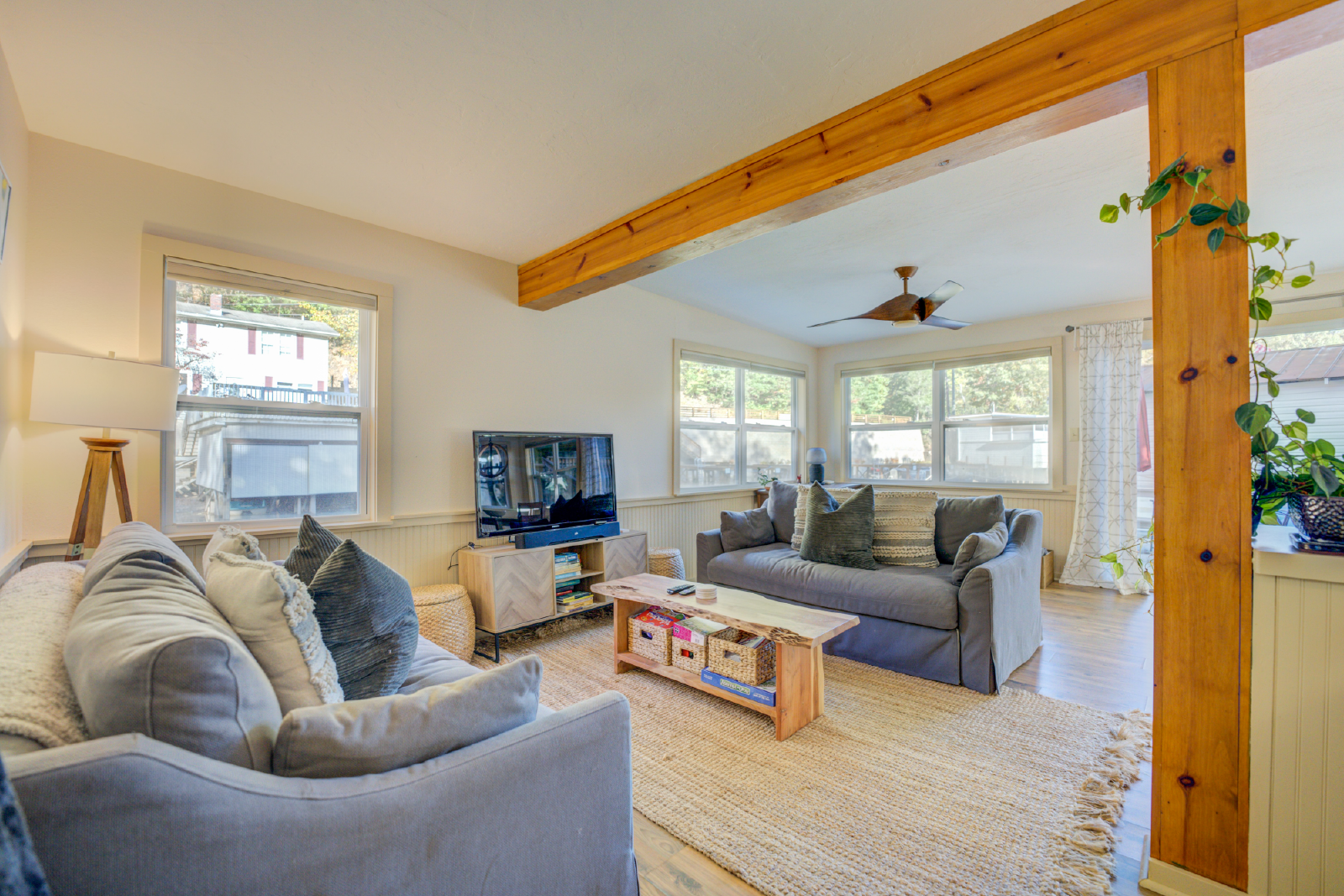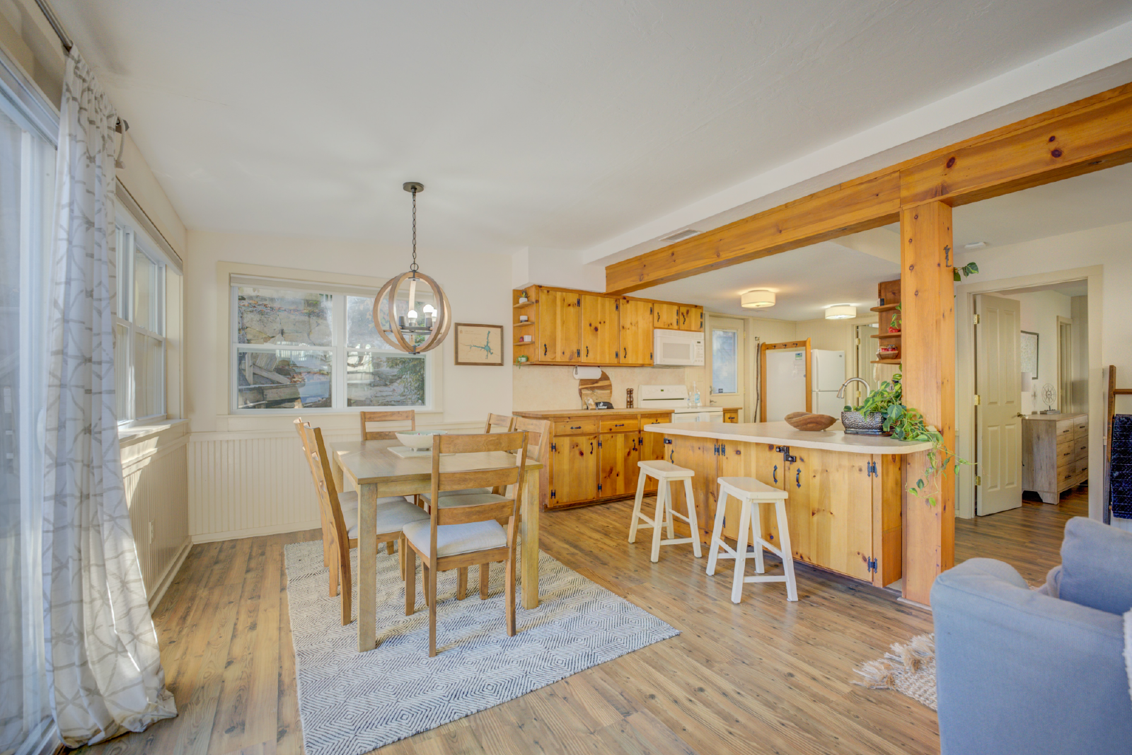 PMI Blue Ridge invites you to come to Lake Lure and stay ON the water. The Cardinal Cottage is built right over the lake and comes complete with a hot tub and 2-person kayak, with a pontoon boat available for rent. The rooftop deck with fire table is a fantastic place to relax. Move down to the table on the dock overlooking the water and end your day with a soak in the hot tub. This is lake life at its best! And bring the dogs (additional fee required)! They will love the lake too.