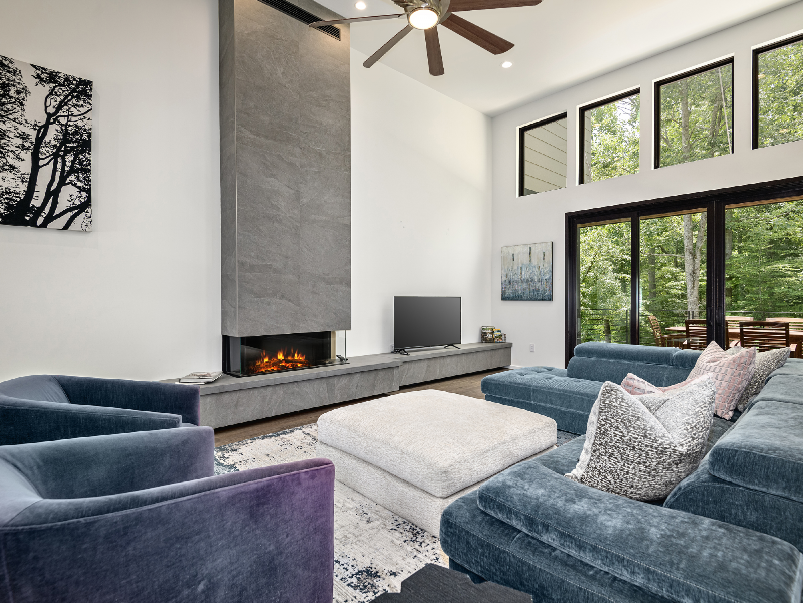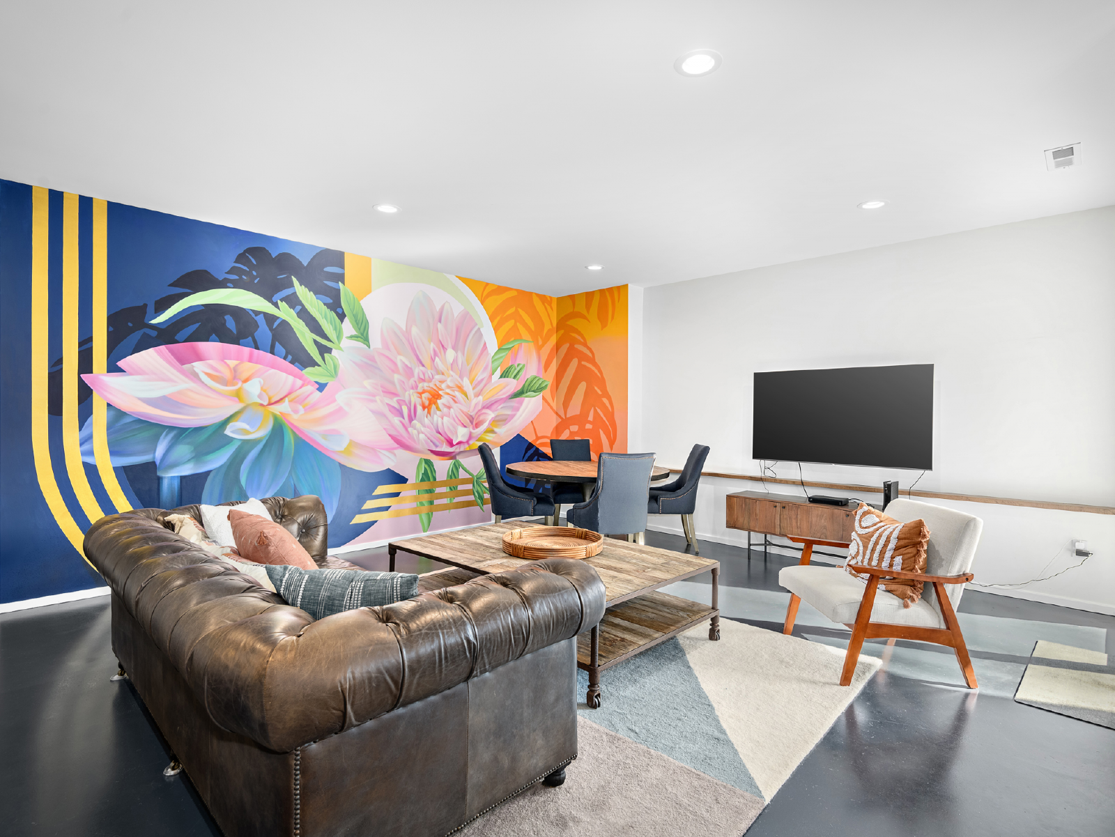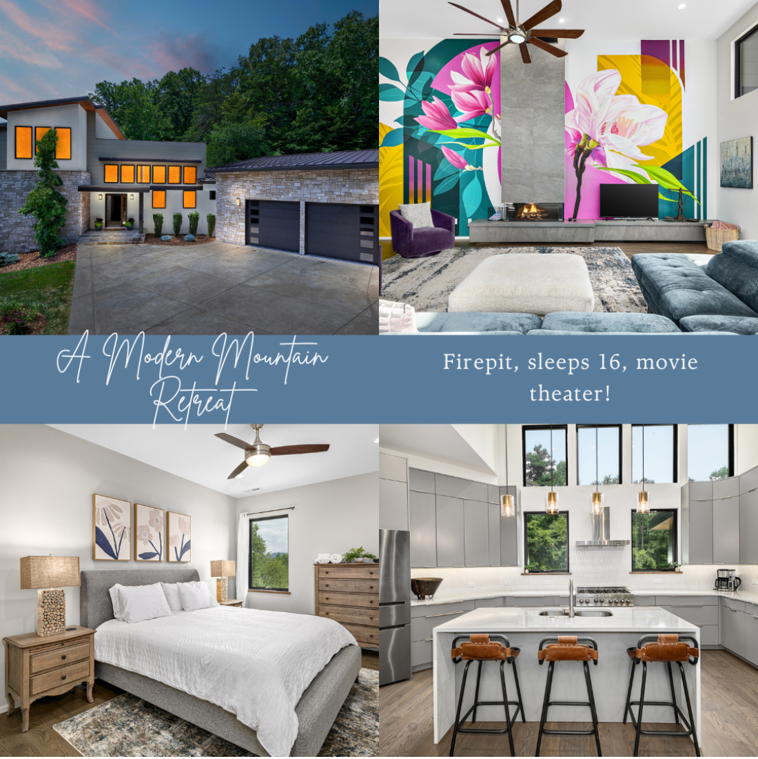 Tucked away down a country road, this 5-bedroom, 5-bathroom home is a modern, art-filled oasis, just a short drive from Asheville and the Biltmore Estate. Our architecturally designed house has everything you'll need for a relaxing stay in the mountains, with some extras you didn't expect (like an indoor movie theater and incredible murals!). With space to spread out, you can enjoy coffee on the back deck overlooking the French Broad River Valley or relax by the fire pit in the evening.