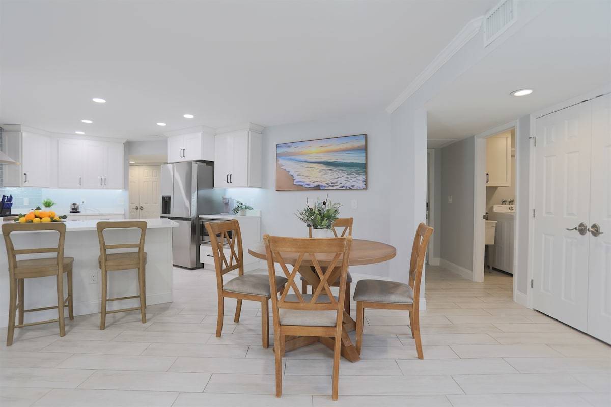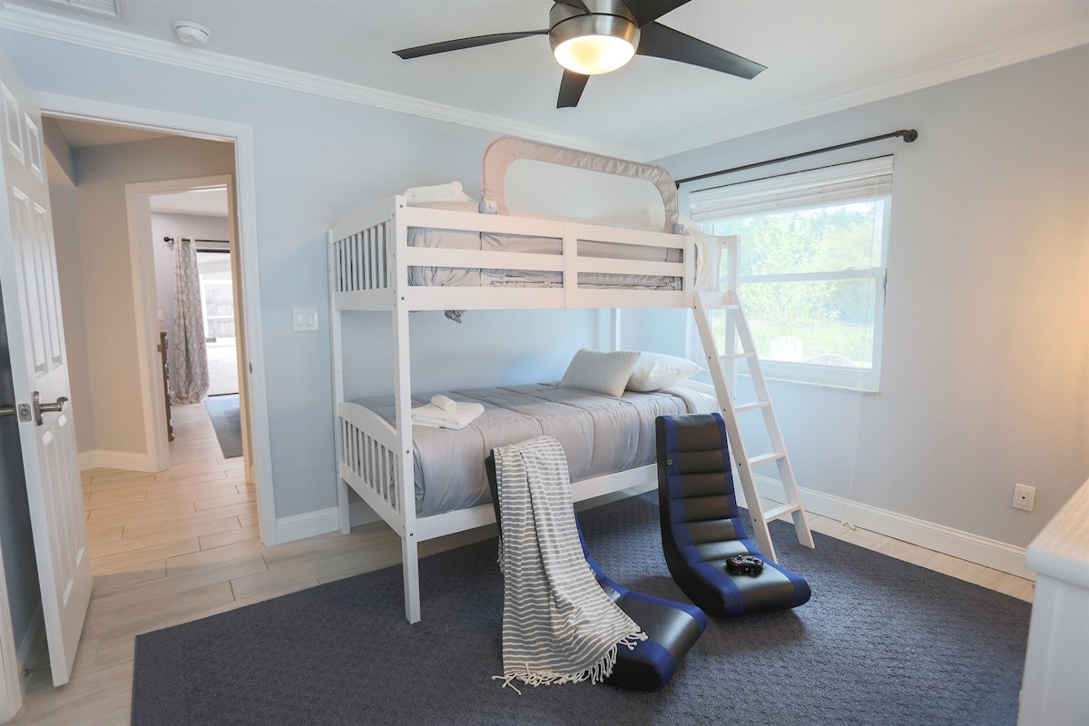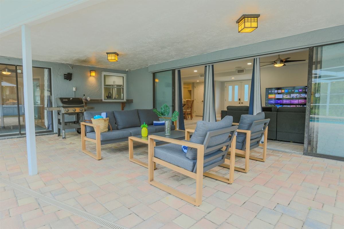 Relax at Sunset Poolhouse — a fully renovated 4 bedrooms retreat in Clearwater with a private pool, firepit, BBQ grill, outdoor seating, games, and sunset views over a serene creek (no rear neighbors!). Enjoy Xbox 360 in the bunk bed kids' room, smart TVs in all bedrooms, a full kitchen, and ample parking. Just 15 mins to Clearwater, Belleair, and Indian Rocks Beach!