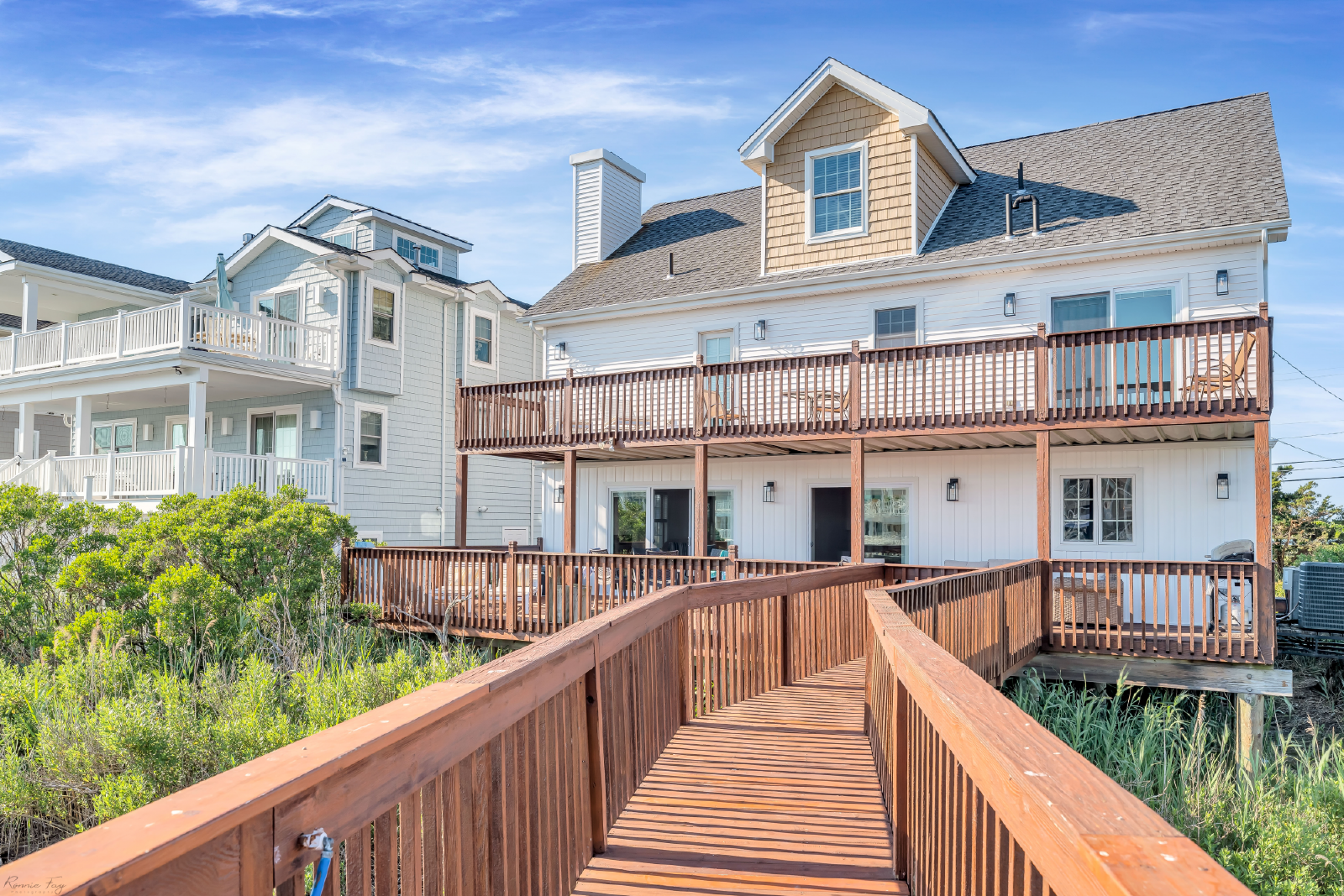 This recently updated home accommodates 12 guests, and features three floors of living with numerous glass doors that open to four large decks, all of which afford sweeping water views. Look over Towsends Inlet from the front, and play in the bay right in your backyard. There is also a large private dock where you and your family can enjoy hours of sunning, swimming, or whiling away a summer afternoon on the bay (there is no through boat traffic!)