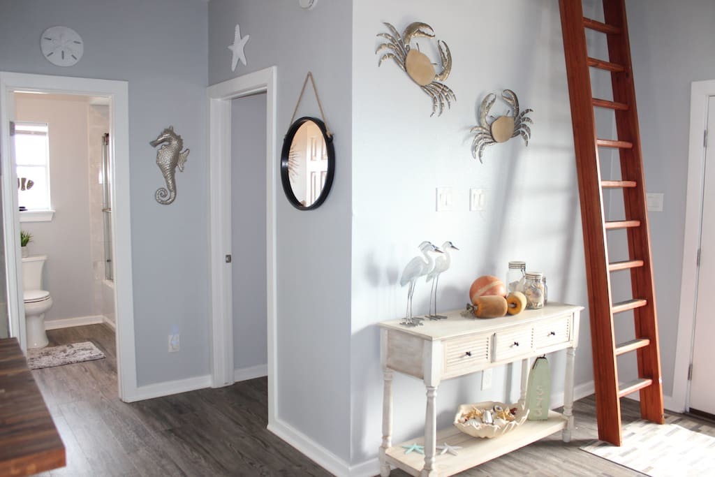 Welcome to Treasure Island! This home is a 3 bedroom (+ two bedroom lofts), 2 bathroom, comfortable & relaxing home with a wrap-around patio allowing for views of early morning sunrise and beautiful sunsets. Suitable for 6-8 guests. Perfect for you and your loved ones looking for an enjoyable coastal retreat with 17 miles of beach access away from the busy life/noise of Galveston. Our beaches are within walking distance for fishing, swimming, shell collecting or sunbathing.