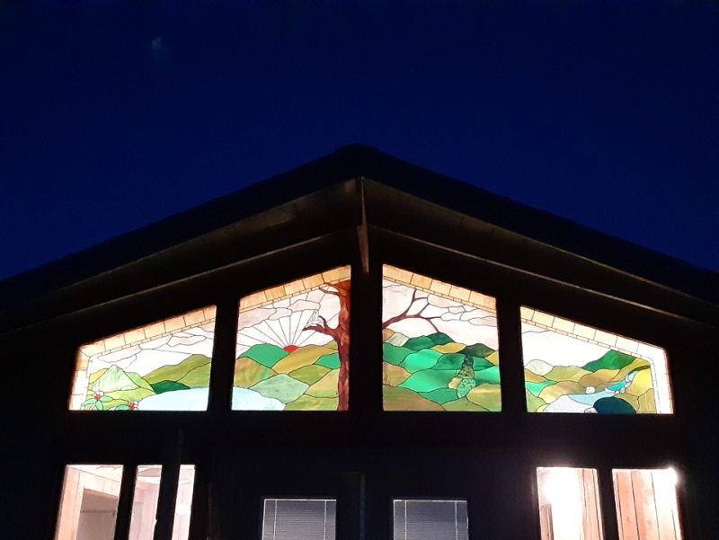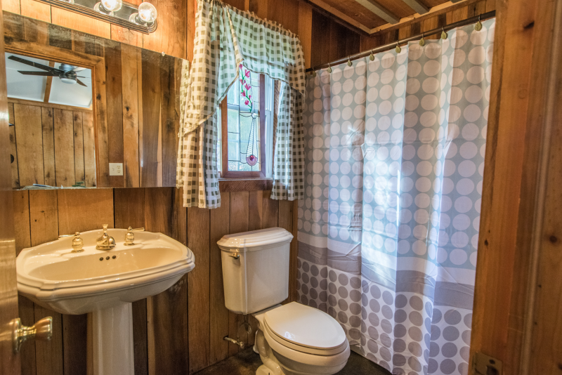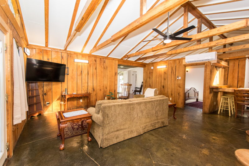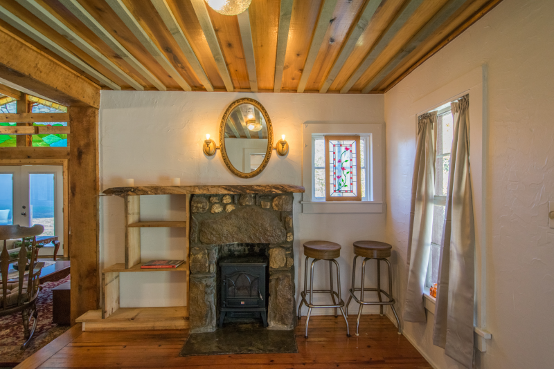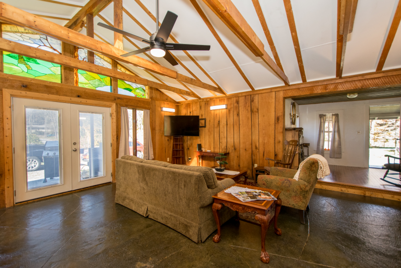 With 2 bedrooms(1 King, 1 Full) 1 bath, comfortably sleep 6 people using the pull out queen size couch. Spend your days in the woods, 20 minutes to Dupont State Forest and 30 minutes to the entrance of Pisgah National Forest, and your nights enjoying world class dining on Main St Hendersonville 5 minutes away. Or relax at the house and enjoy the beauty of the stained glass morals throughout the cabin.