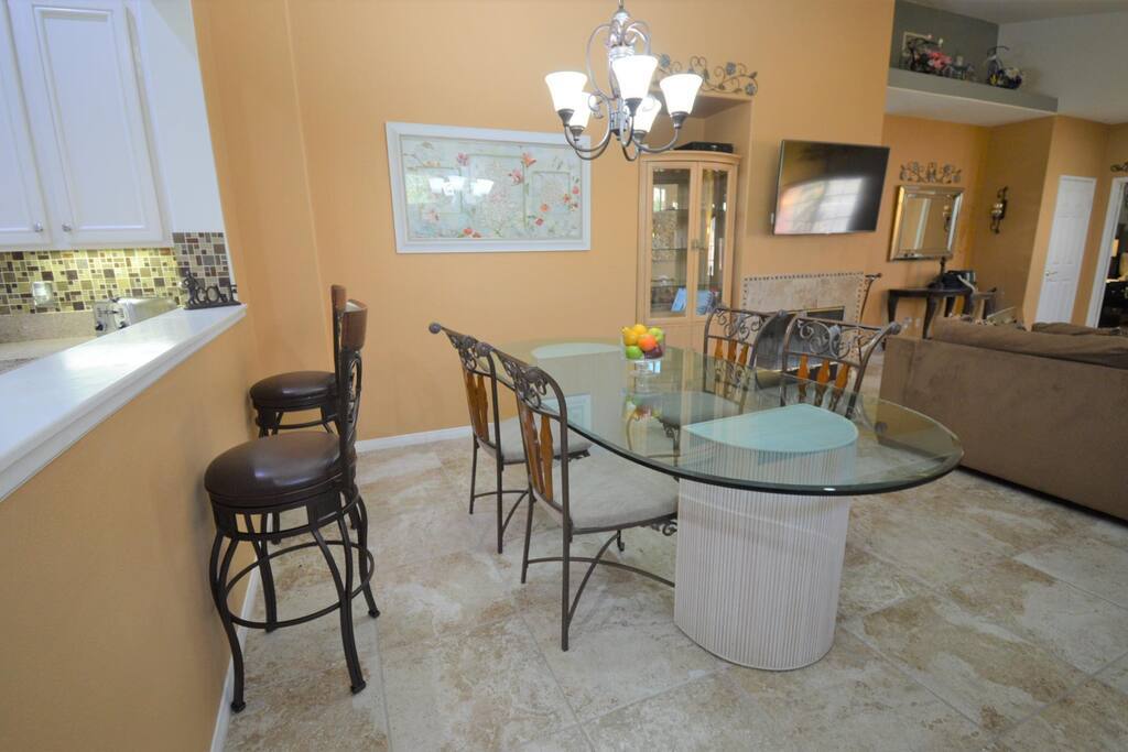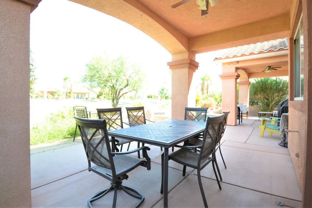 Furnished as a golfers dream get, this home is open and airy with a view of the 7th tee. Entry is via a private courtyard and the open floorplan consists of tiled floors in the main living areas with a gas fireplace between the living and dining spaces. The kitchen has a breakfast bar, stainless appliances, wine fridge, Keurig coffee-maker, and access to the rear covered patio, private pool/spa, grill, and expansive course views to relax and enjoy! There are 3 bedrooms--2 with full-bathrooms attached--and a guest bathroom, separate laundry room, and attached 2-car garage for your practical use and convenience. Just bring your vacation spirit and enjoy the comforts of home at the Lucky Horseshoe Golf Retreat!