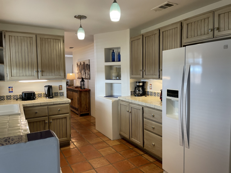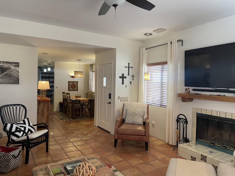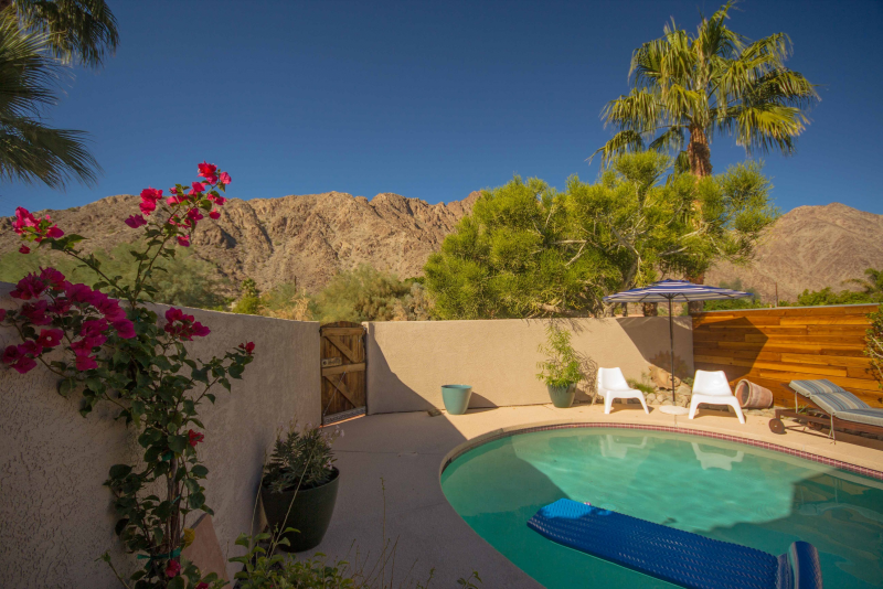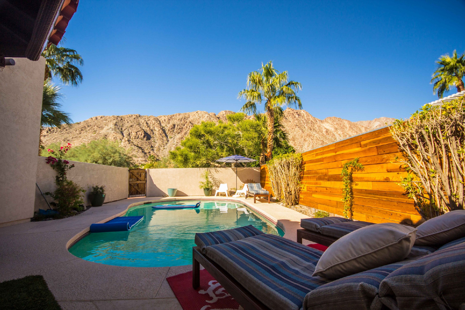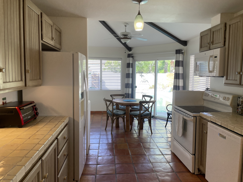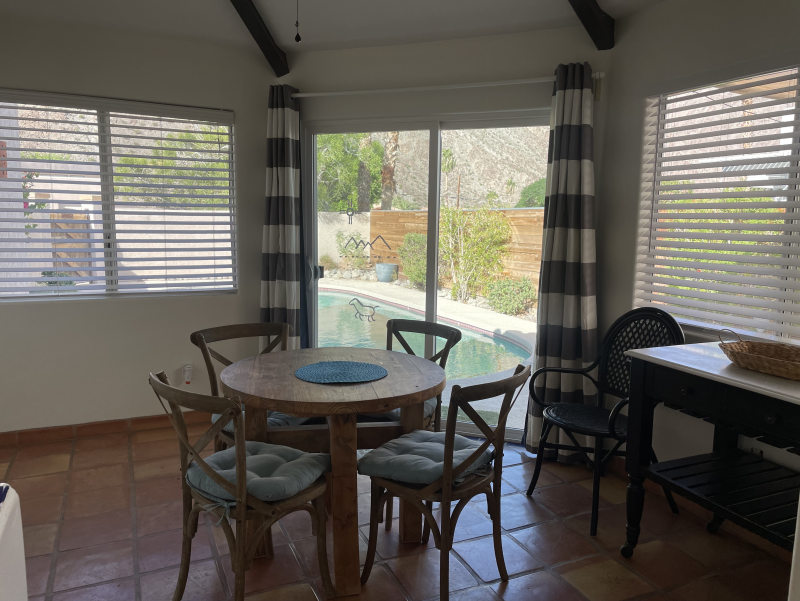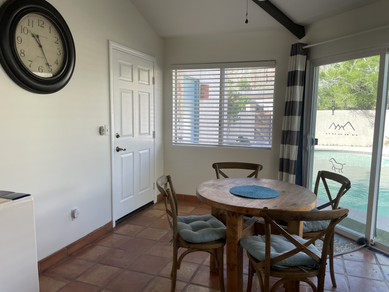 Wild Horses is a beautifully remodeled furnished home with a custom Southwestern flare that sits on the perimeter of the La Quinta Cove where there are unobstructed and spectacular mountain views. Enjoy the natural beauty of the Bear Creek nature trail, the paved pathway to the top of the Santa Rosa Mountains that is just steps away from the front gate, in addition to the many more hiking and biking trails to experience. Enclosed and private, there are three bedrooms and two bathrooms. Once you enter the private courtyard, there is the Pebble-Tec, heated pool and outdoor furnished, covered patio and grill for your outdoor relaxing and dining pleasures. The interior of the home is bright and light with high ceilings, hand-painted Mexican tiles and sinks, and ceiling fans throughout. For your added comfort and convenience, there is a fireplace in the main living room, a separate laundry room with full-size washer and dryer, and double-car garage. You will also be cooking with gas in the kitchen supplied with stainless steel appliances, for dining at bistro seating in the breakfast nook or in the separate dining area. Each bedroom has French doors leading to the outside of the home. The primary suite has a king-size bed, large walk-in closet, and a walk-in shower. The guest bedrooms have queen-size beds, ceiling fans, and Smart TVs; guest bathroom is equipped with a tub/shower combo. In the mood for going out to dinner or shopping? There's a trail for that! Nestled in the cozy La Quinta Cove, you are minutes away from Old Towne for La Quinta's fine dining, shopping and hiking, and you are not far from the exciting Indio golf/horse community, Palm Desert/El Paseo dining and shopping, and a little further west are the artistic and laid-back communities of Rancho Mirage and Palm Springs.