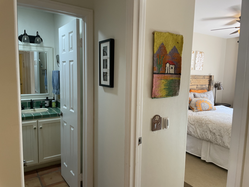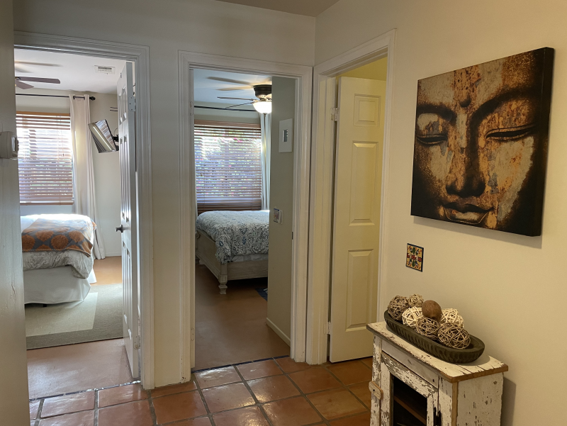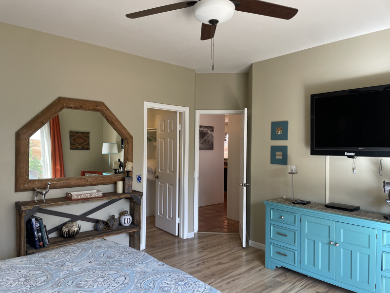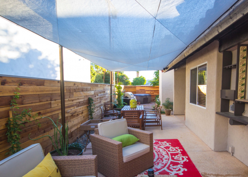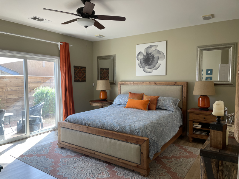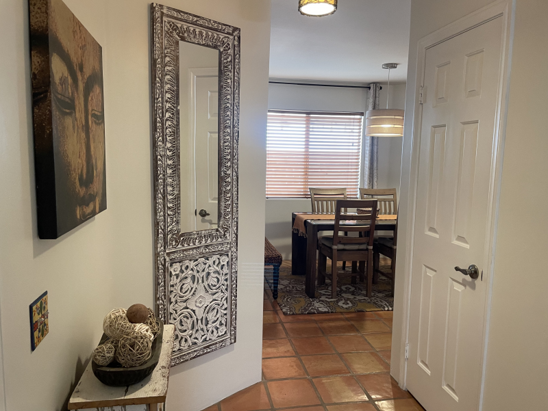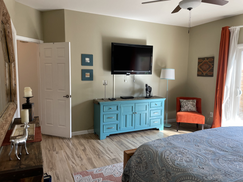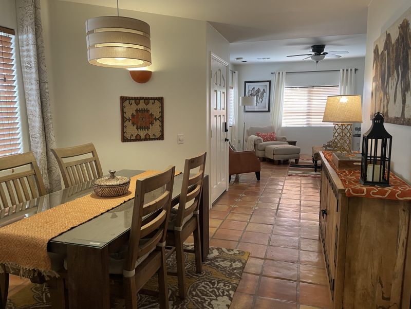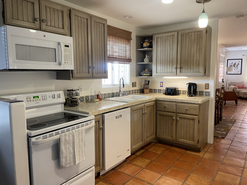 Wild Horses is a beautifully remodeled furnished home with a custom Southwestern flare that sits on the perimeter of the La Quinta Cove where there are unobstructed and spectacular mountain views. Enjoy the natural beauty of the Bear Creek nature trail, the paved pathway to the top of the Santa Rosa Mountains that is just steps away from the front gate, in addition to the many more hiking and biking trails to experience. Enclosed and private, there are three bedrooms and two bathrooms. Once you enter the private courtyard, there is the Pebble-Tec, heated pool and outdoor furnished, covered patio and grill for your outdoor relaxing and dining pleasures. The interior of the home is bright and light with high ceilings, hand-painted Mexican tiles and sinks, and ceiling fans throughout. For your added comfort and convenience, there is a fireplace in the main living room, a separate laundry room with full-size washer and dryer, and double-car garage. You will also be cooking with gas in the kitchen supplied with stainless steel appliances, for dining at bistro seating in the breakfast nook or in the separate dining area. Each bedroom has French doors leading to the outside of the home. The primary suite has a king-size bed, large walk-in closet, and a walk-in shower. The guest bedrooms have queen-size beds, ceiling fans, and Smart TVs; guest bathroom is equipped with a tub/shower combo. In the mood for going out to dinner or shopping? There's a trail for that! Nestled in the cozy La Quinta Cove, you are minutes away from Old Towne for La Quinta's fine dining, shopping and hiking, and you are not far from the exciting Indio golf/horse community, Palm Desert/El Paseo dining and shopping, and a little further west are the artistic and laid-back communities of Rancho Mirage and Palm Springs.