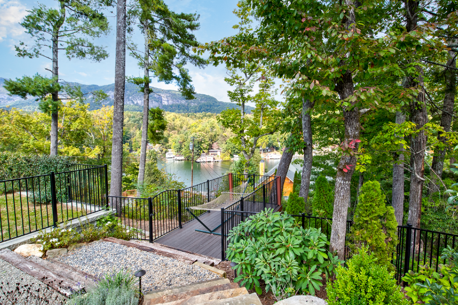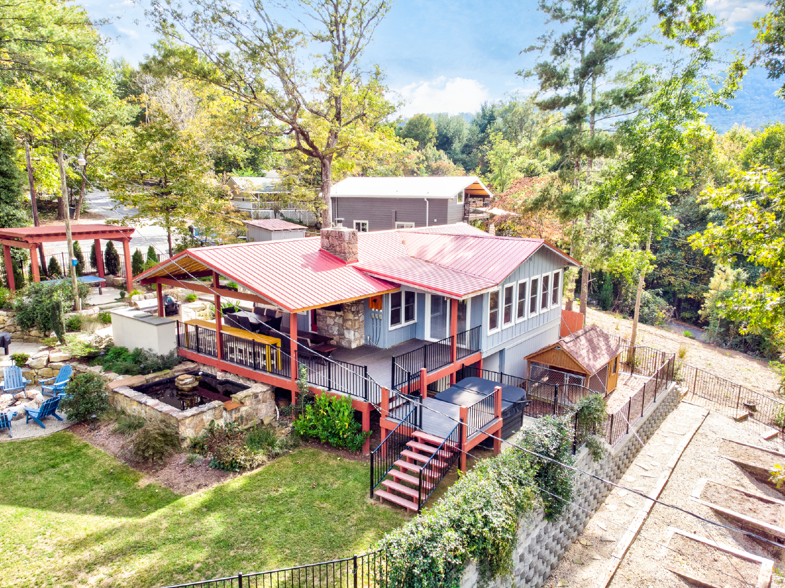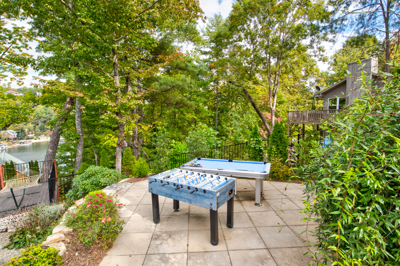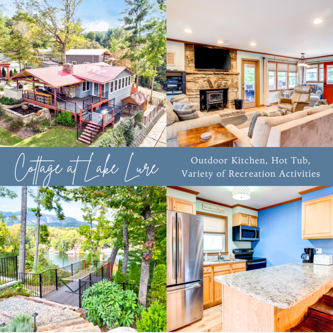 Come for the views and sounds of the Lake and Mountains, stay for the amenities. Cottage at Lake Lure has it ALL! The outside area, perfectly landscaped, outdoor seating, dining & kitchen (Both Gas and Green Egg grill), pool table, Foosball table, koi pond, water fall, two fire places, outdoor heaters, big screen tv, darts and a nice grassy area for kids to play. Minutes from town and 10 minutes to Chimney Rock