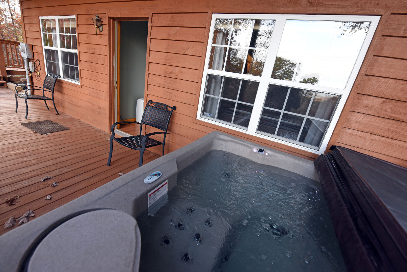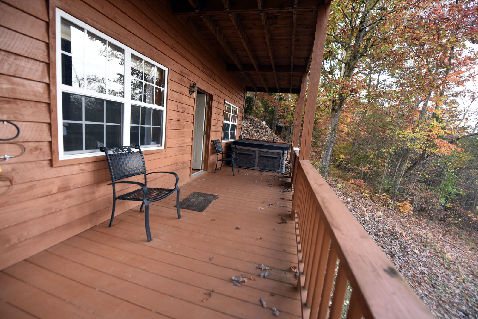 You will have access to the lower level porch just off the living area/game room side. There is a five person hot tub and additional seating as well.