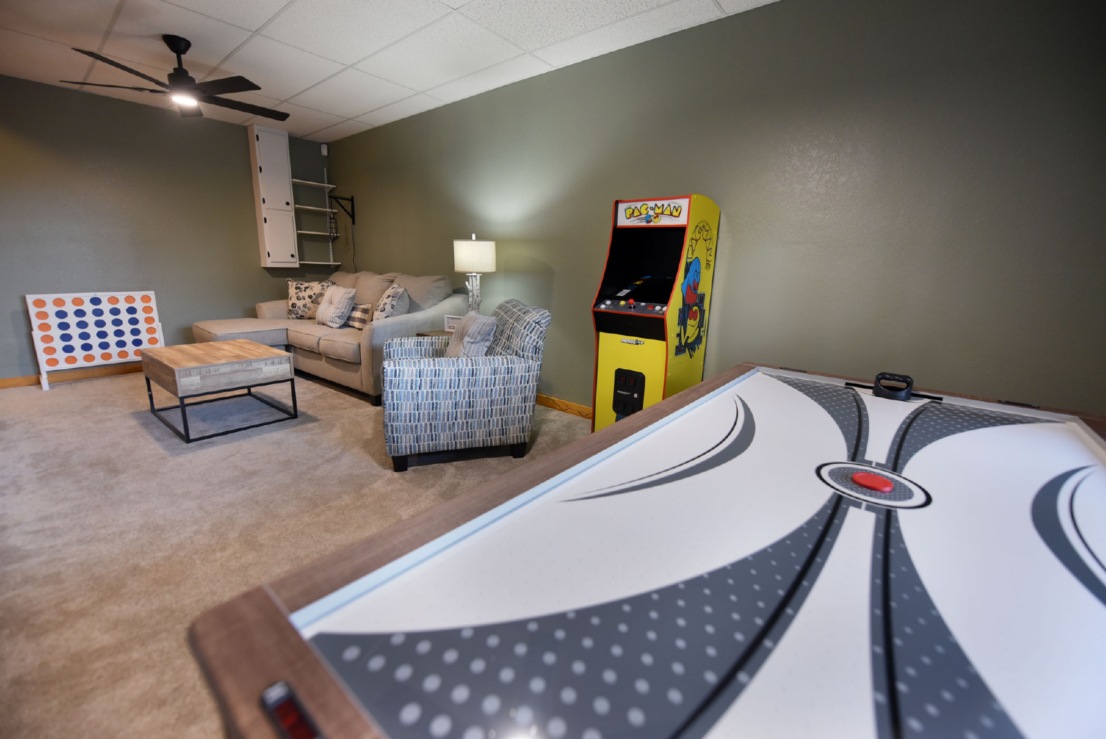 The right side has an additional living area with Smart TV, air hockey/ping pong table combo, PacMan arcade game, several board games and puzzles to enjoy!