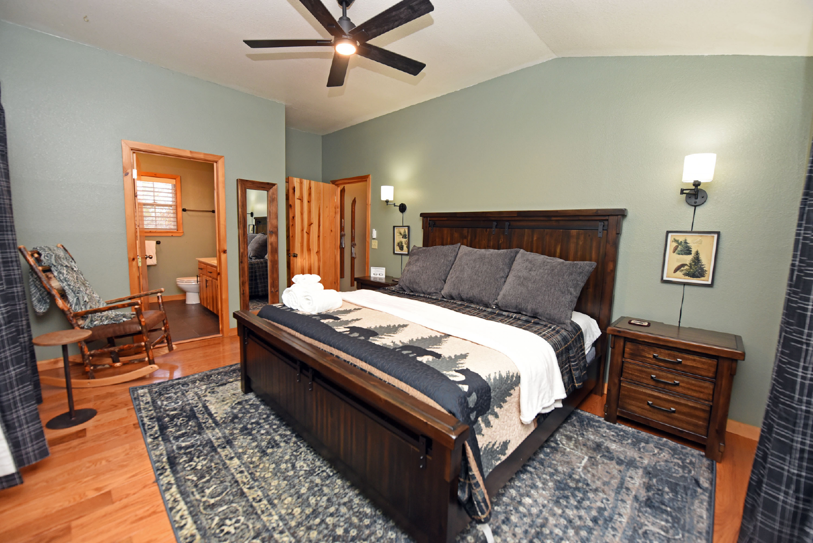 The first of three bedrooms is on the main floor and features a king bed and seating area. A full size bathroom is just outside the bedroom door and has a walk-in shower and new tile flooring.