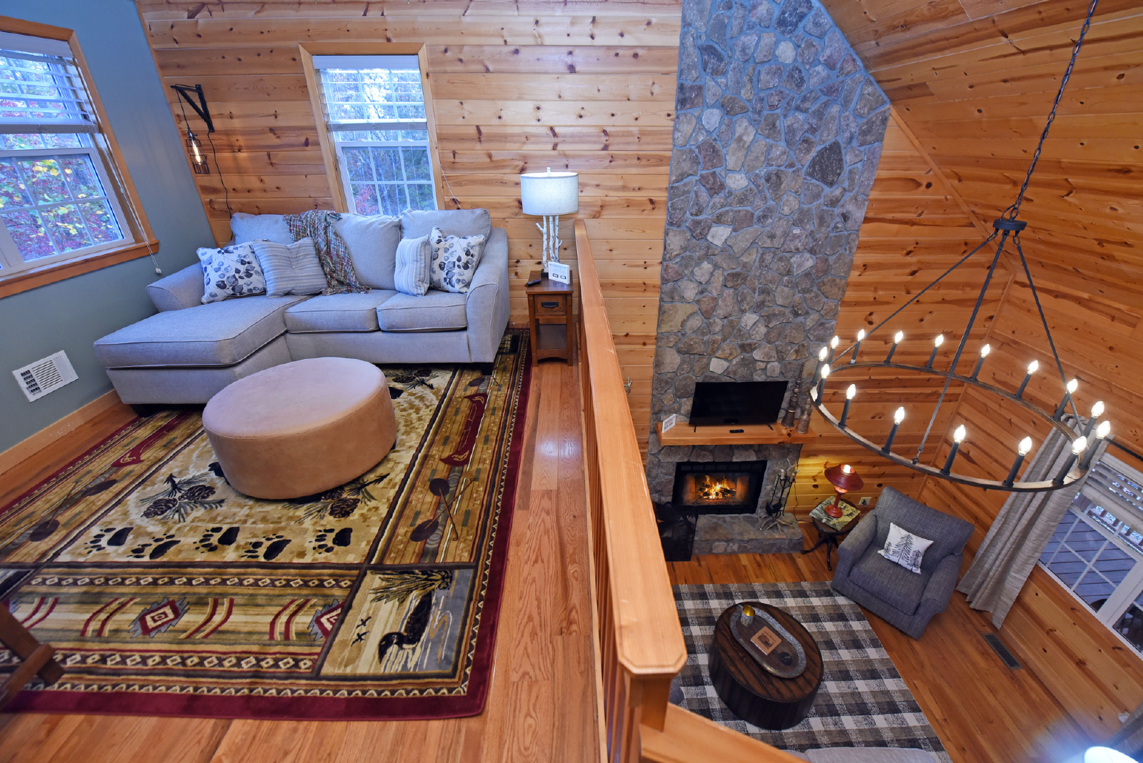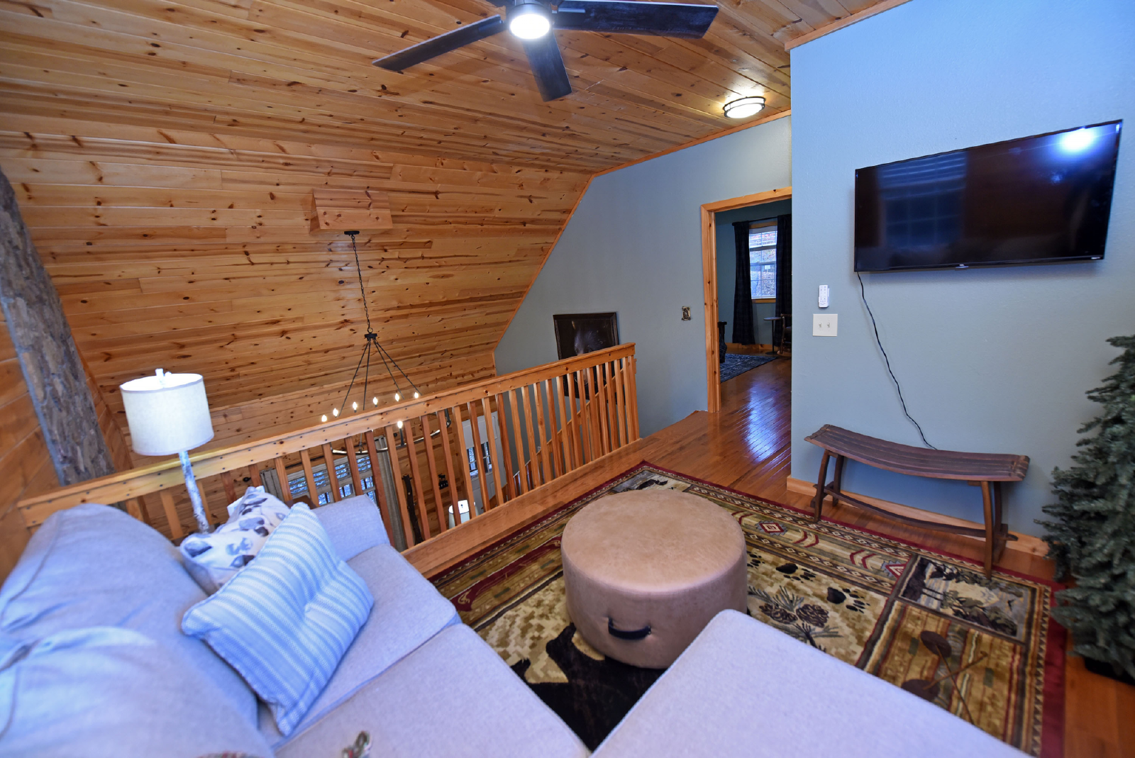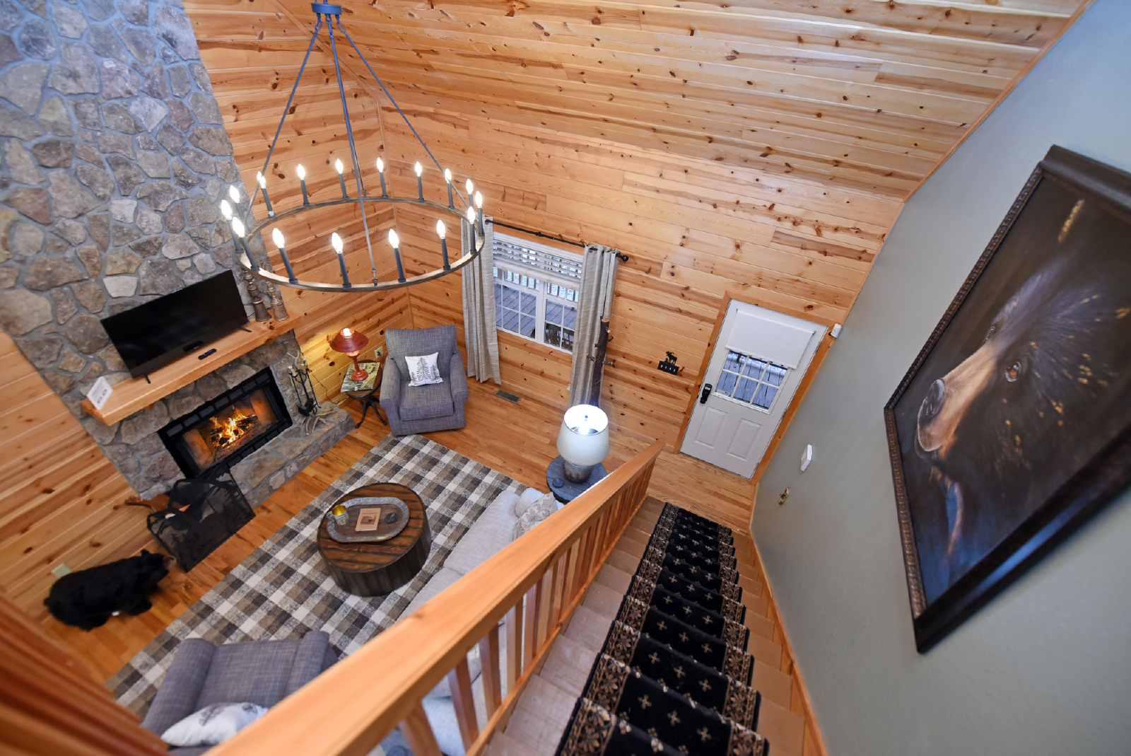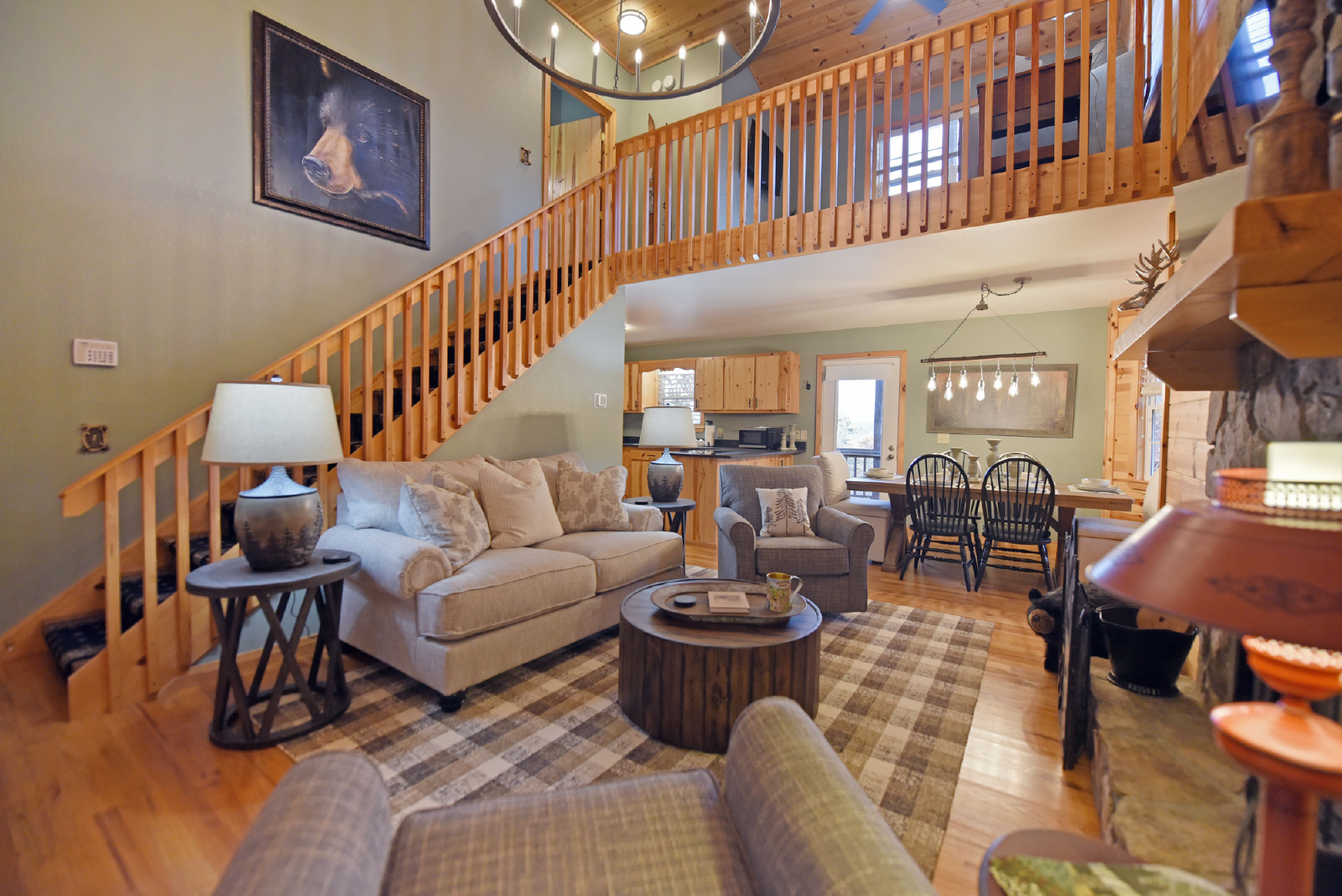 The upstairs includes a loft area that has a sofa bed/seating area and Smart TV. The master bedroom is to the left at the top of the stairs featuring a king size bed, seating area and full size bathroom with walk-in shower and new tile floor. A desk and chair is also provided.