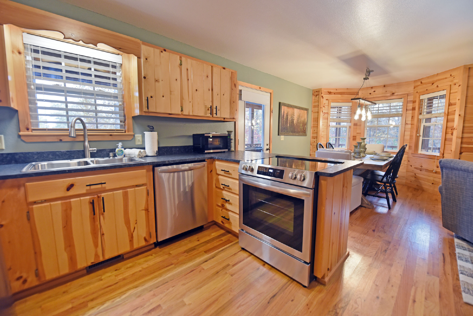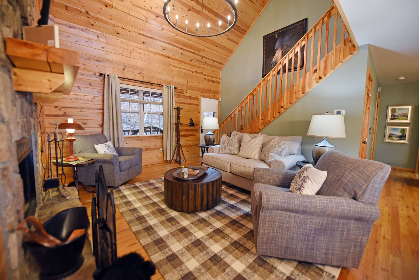 You will enter the home directly off the front porch into a very cozy living room featuring a wood burning fireplace, new comfortable furniture, Smart TV and perfect gathering space for family.