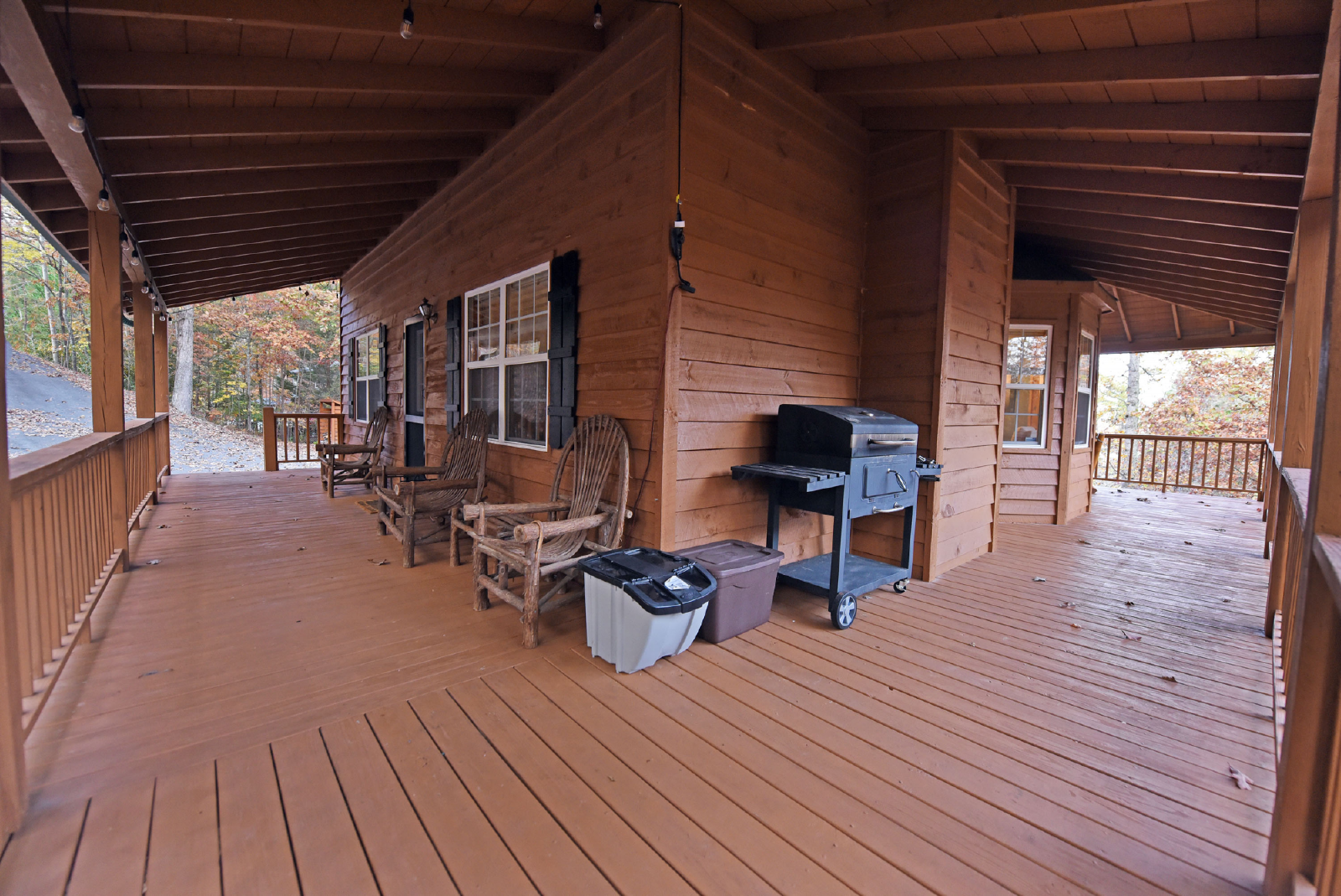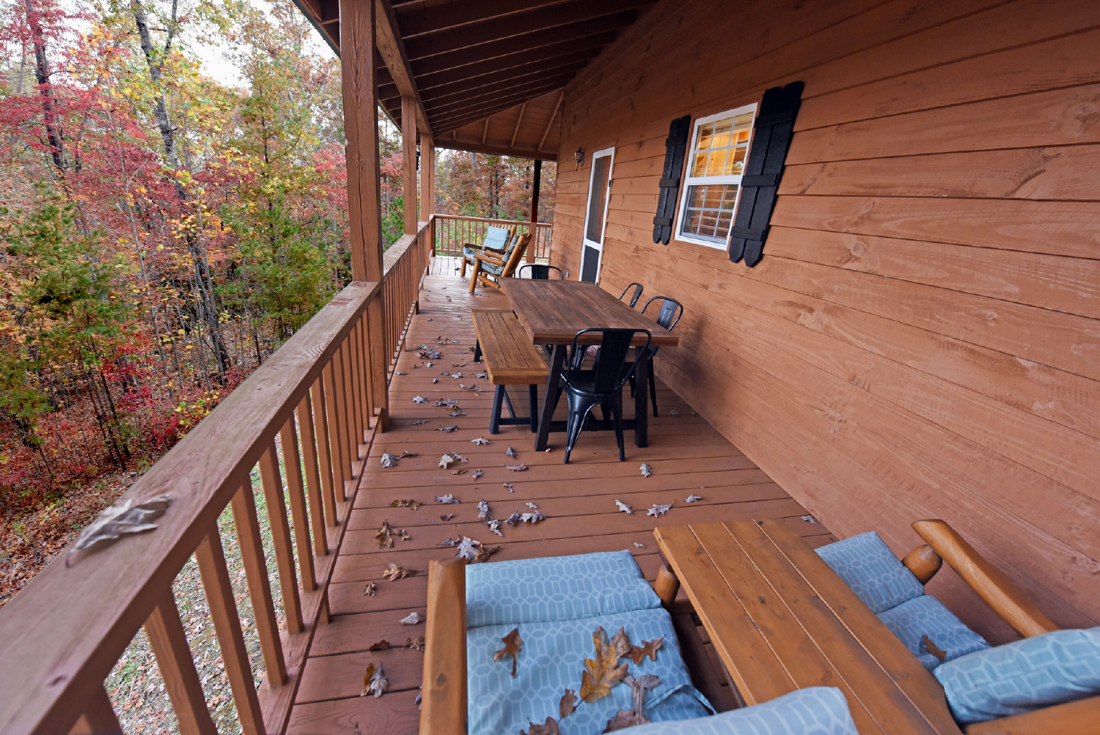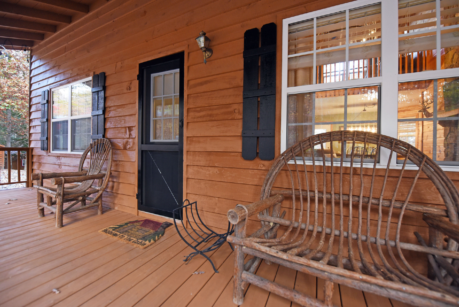 Access to the main level porch is between the kitchen and dining area. There is an outdoor dining table for six, rockers and additional seating area to enjoy the mountain views and abundant wildlife in the area. There is also a charcoal grill on the right side porch.