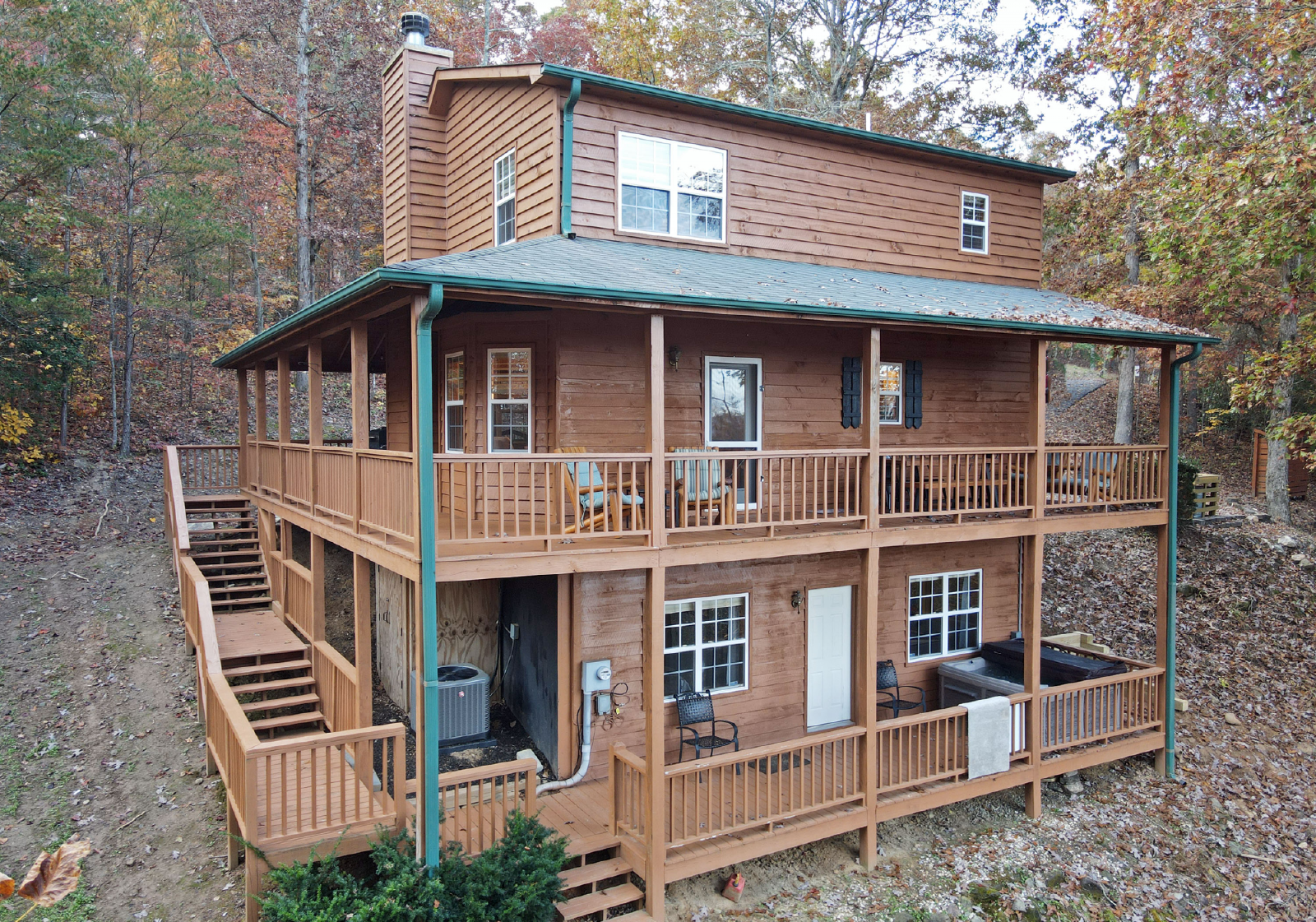 The front porch has additional seating and a fire pit is just off to the left and there are steps leading to the lower level to access the hot tub on the lower level porch.