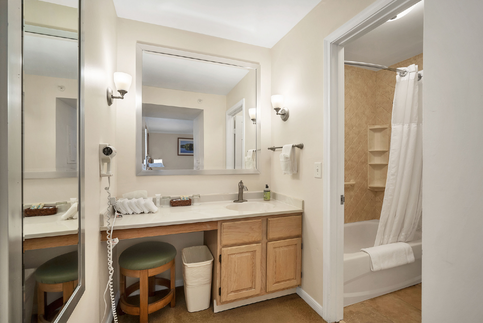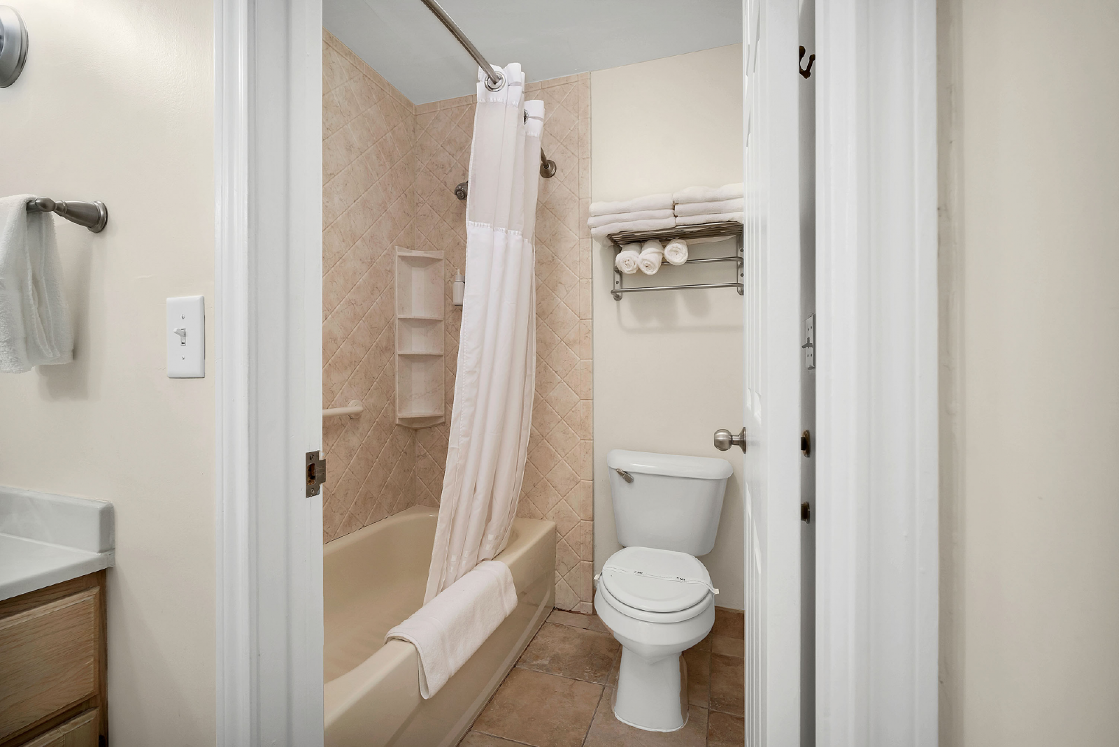 The bathroom, situated off the bedroom, features a full tub and shower combo, perfect for a refreshing shower or a relaxing soak. We ensure the bathroom is well-stocked for your convenience, providing an array of guest towels along with high-quality shampoo, conditioner, and body wash. Additionally, essential paper products are readily available. For your grooming needs, a hair dryer is provided, ensuring you have everything you need for a comfortable and hassle-free stay.