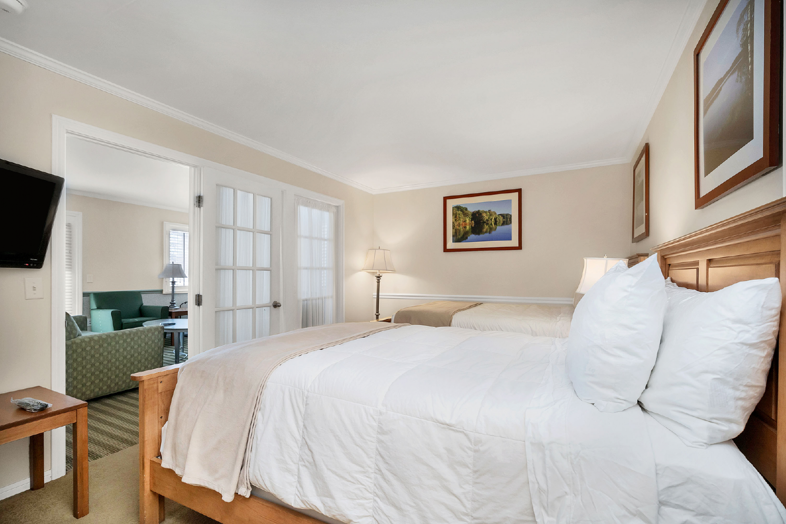 The bedroom features two full-sized beds, each prepared with fresh linens, pillows, and throws for your comfort. These inviting beds are ready for your arrival, ensuring a restful night's sleep. The bedroom closet is thoughtfully equipped with clothes hangers, an iron and ironing board, a vacuum cleaner, and a fold-out luggage rack for your convenience. Additionally, the bedroom boasts an HDTV with cable access, providing a private and relaxing space for entertainment at any time of the day or night.